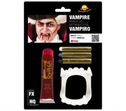Sztuczna krew + zęby wampira + kredki do twarzy