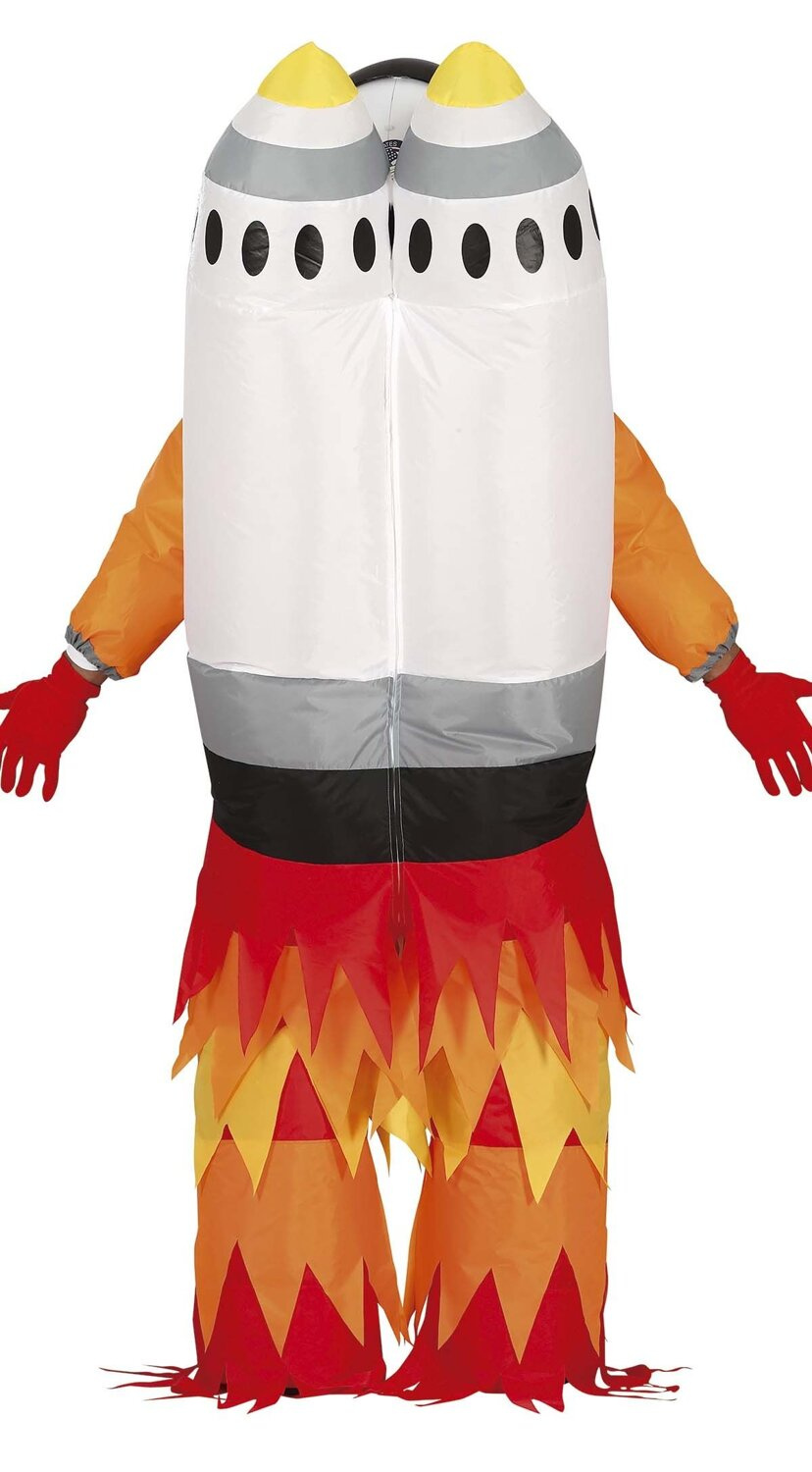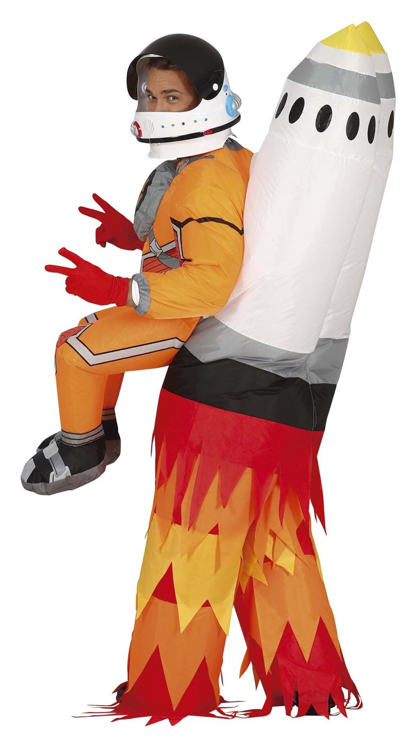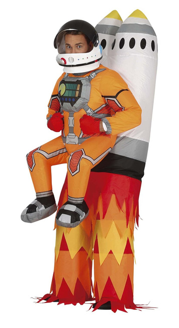Humorystyczny i kreatywny kostium astronauty na rakiecie. Strój tworzy iluzję, że astronauta siedzi na rakiecie, która właśnie startuje. Całość to jednoczęściowy kombinezon w którym głowa jest głową astronauty, natomiast nogi osoby noszącej kostium są ukryte w płomieniach, co dodaje dynamicznego efektu. Astronauta nosi pomarańczowy kombinezon kosmiczny z czarnymi i szarymi detalami, które imitują prawdziwy skafander astronauty. Kombinezon jest dobrze dopasowany i ma realistyczne akcenty, takie jak pasy i zapięcia. Rakieta jest dużą, nadmuchiwaną konstrukcją, którą osoba nosi na plecach. Rakieta ma typowy kształt z ostrymi końcówkami i detalami imitującymi okna. Maszyna jest głównie biała z czarnymi i szarymi detalami, które podkreślają jej realistyczny wygląd. Na dole rakiety znajdują się płomienie, które są wykonane z materiału w kolorach czerwonym, pomarańczowym i żółtym, imitujące odlot rakiety. Płomienie są również częścią dolnej części kostiumu, zasłaniając nogi osoby noszącej kostium.