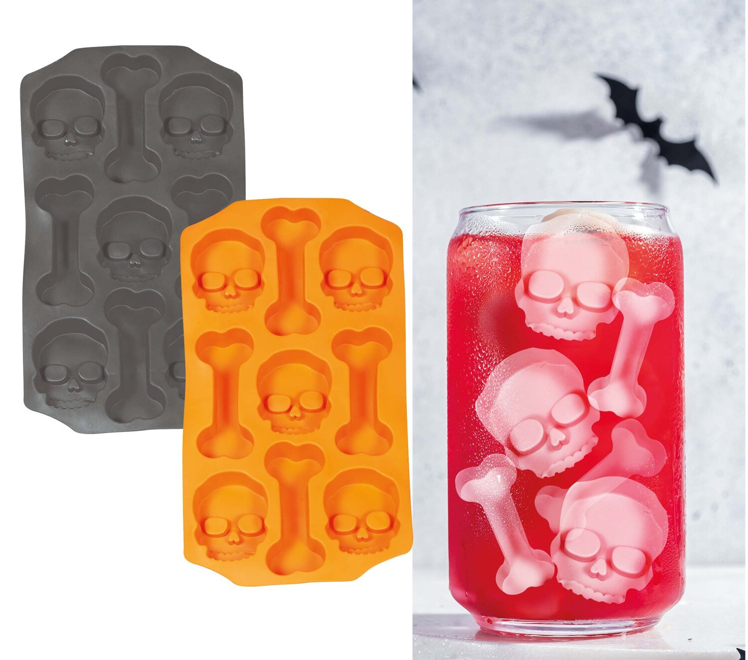 Silikonowa foremka do zrobienia kostek lodu, posłuży także do żelków lub małych galaretek w kształcie kości oraz czaszek. Może posłużyć także jako odcisk np. dla masy cukrowej. Znakomita forma podania napojów, drinków, deseru na imprezie z okazji Halloween lub horror party.