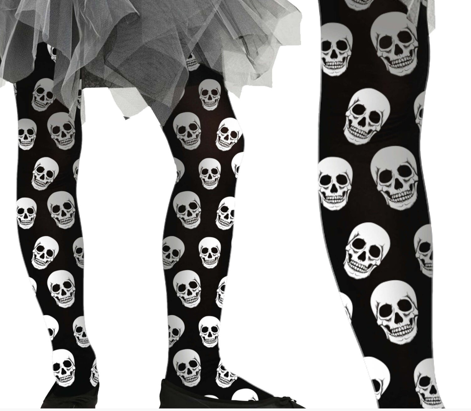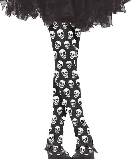 • Rajstopy dziecięce czarne ze wzorkiem w białe trupie czaszki. Rajstopy mają nogawki zakończone przy palcach szwem. Nie posiadają klina ani stopki.