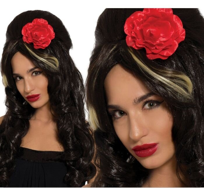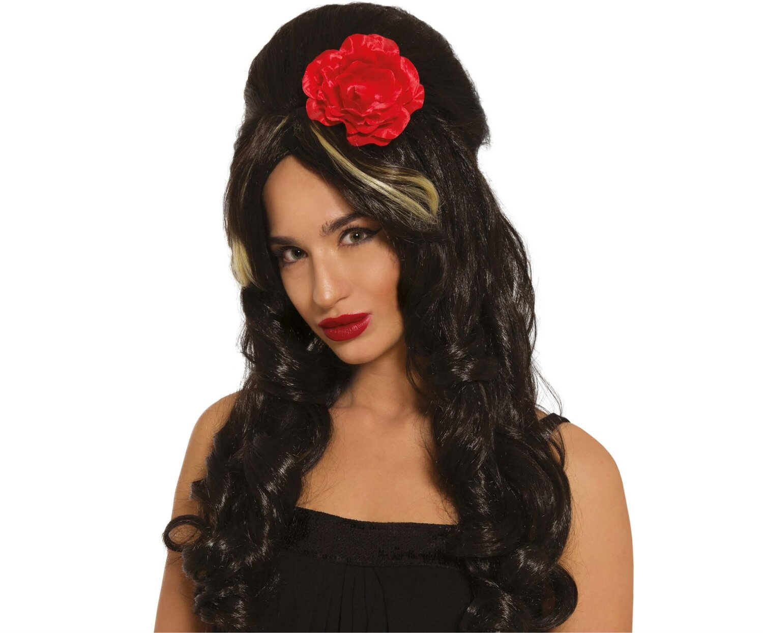 - Peruka w stylu retro z dodatkiem kwiatowego akcentu. Włosy ciemne z jasnymi pasemkami. Fryzura ułożona z dużą objętością na górze, charakterystyczną dla lat 60-tych. Idealne do przebrania hiszpańskiej tancerki Flamenco lub Meksykanki.