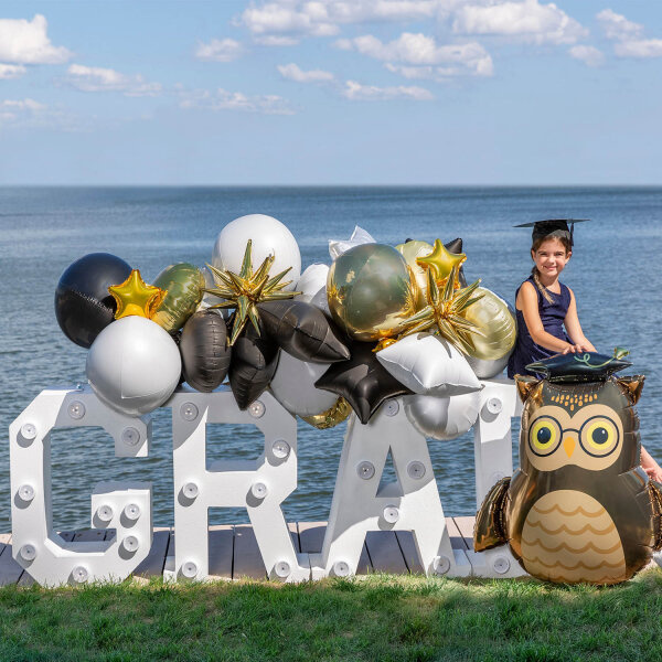 - Foliowy balon w kształcie sowy absolwenta w okularach oraz birecie. Ptaszek trzyma w dłoni dyplom. Znakomita dekoracja lub prezent dla każdego kto zakończył etap nauki.