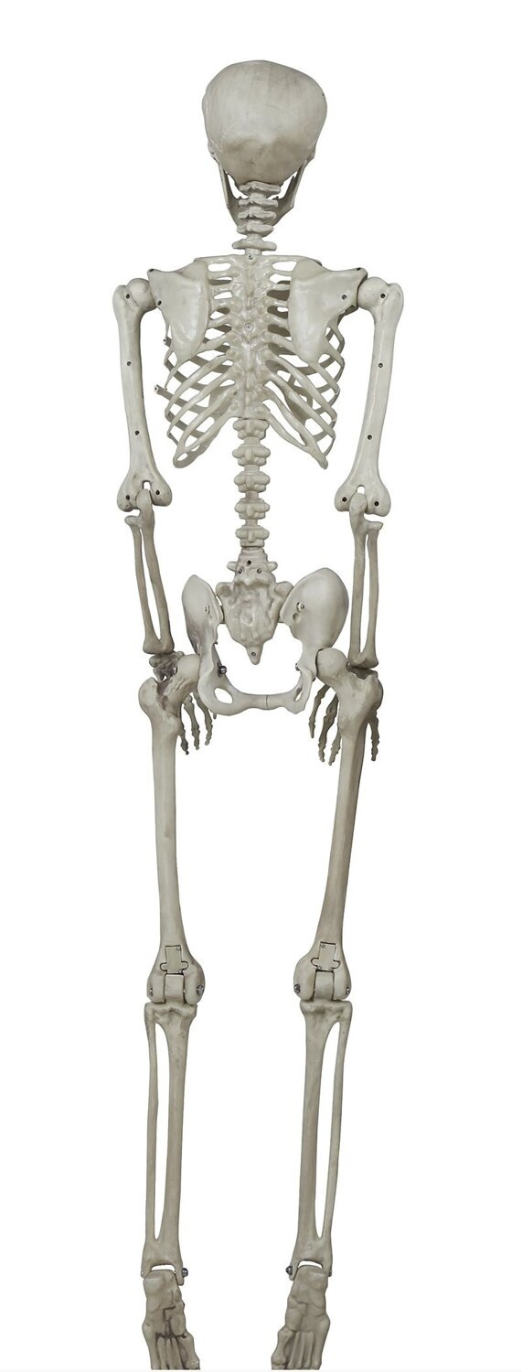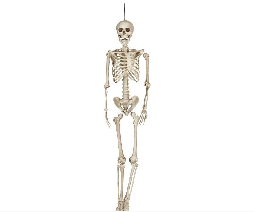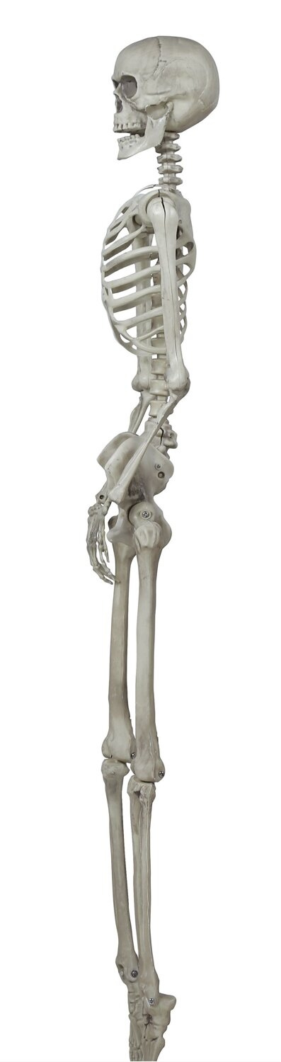 Bliski naturalnych wymiarów, trójwymiarowy szkielet człowieka do dekoracji na Halloween. Szkielet jest anatomicznie odwzorowany, z wyraźnymi kośćmi, takimi jak czaszka, żebra, miednica i kończyny. Szkielet wykonany z tworzywa, posiada ruchome nogi, ręce, stawy, głowę oraz żuchwę - dzięki czemu można nadać mu różne pozycje, np siedzącą, z nogą założoną na nogę itp.