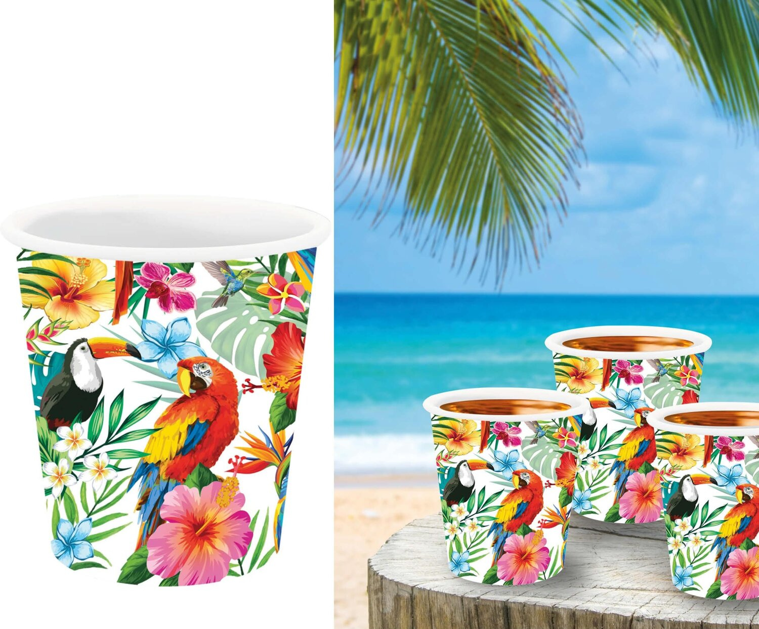 Kieliszki znakomite do wódki lub innych szotów na letnie przyjęcia. Wykonane z białego tworzywa, posiadają nadruk papug, tukanów wśród tropikalnej roślinności. Znakomicie dopełnią dekorację stołu lub bufetu na hawajskie luau.