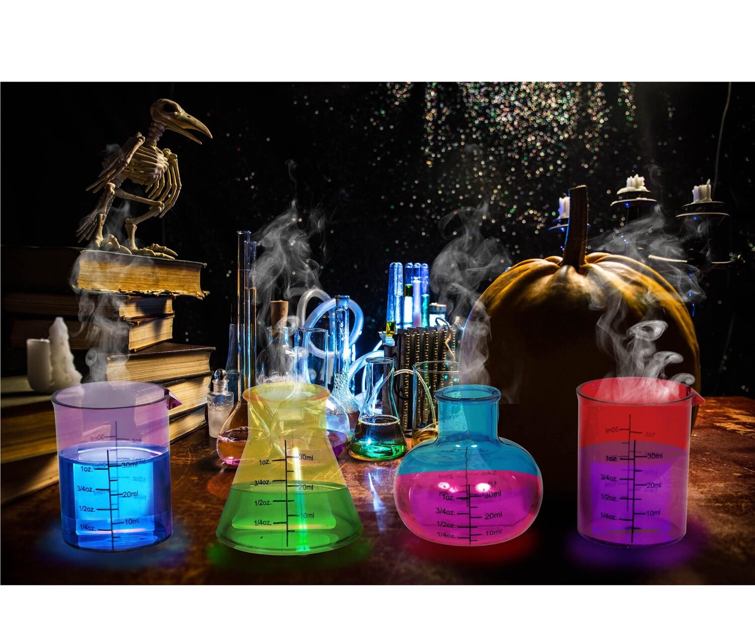 Kieliszki w kształcie różnych laboratoryjnych naczyń miarowych. Każde naczynie ma miarkę w mililitrach oraz uncjach, co nadaje im zarówno funkcjonalny, jak i ciekawy wizualnie wygląd. Są one wykonane z kolorowego tworzywa – czerwonego, niebieskiego, fioletowego i żółtego, co dodaje im efektu naukowego laboratorium.
