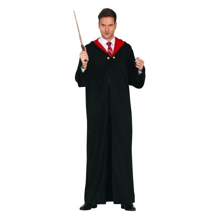 Kostium czarodzieja - ucznia magii inspirowany szkolną szatą czarodzieja. Długa szata - toga posiada długie rękawy i kapturem. Tunika jest w czarnym kolorze, zapinana z przodu na rzep. Zapięcie zdobią dwa pozłacane guziki, co nadaje stroju elegancji. Rękawy rozkloszowane, kaptur obszyty jest od wewnątrz czerwonym materiałem.