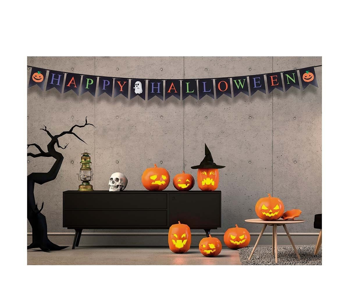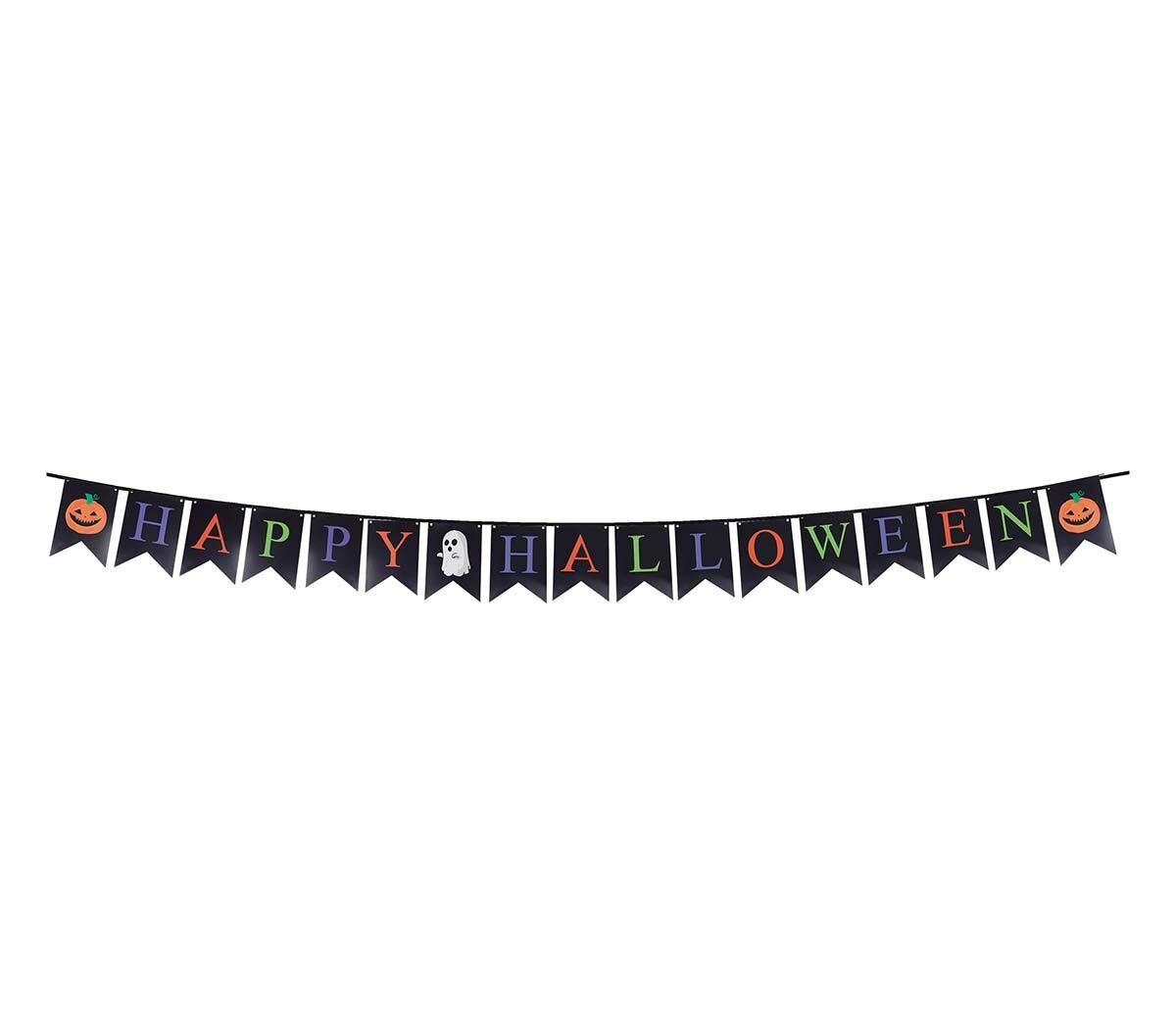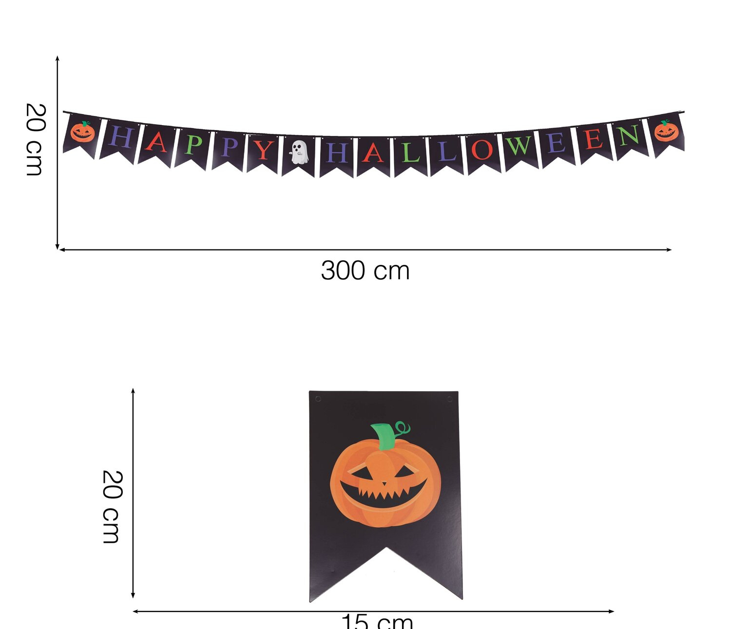 Girlanda składa się z czarnych, prostokątnych tekturek - flag z kolorowymi literami. Baner tworzy napis HAPPY HALLOWEEN. Nadruki literek są w różnych kolorach: pomarańczowym, fioletowym i zielonym. Po obu stronach napisu znajdują się symbole dyni i ducha, które dodają klimatu Halloween. Dekorację należy nawlec samemu na załączoną czarną wstążkę o szerokości 5 mm. Nadruk kolorowy, tył gładki - biały. Baner może być zawieszony zarówno w jednym jak i dwóch rzędach, według uznania.