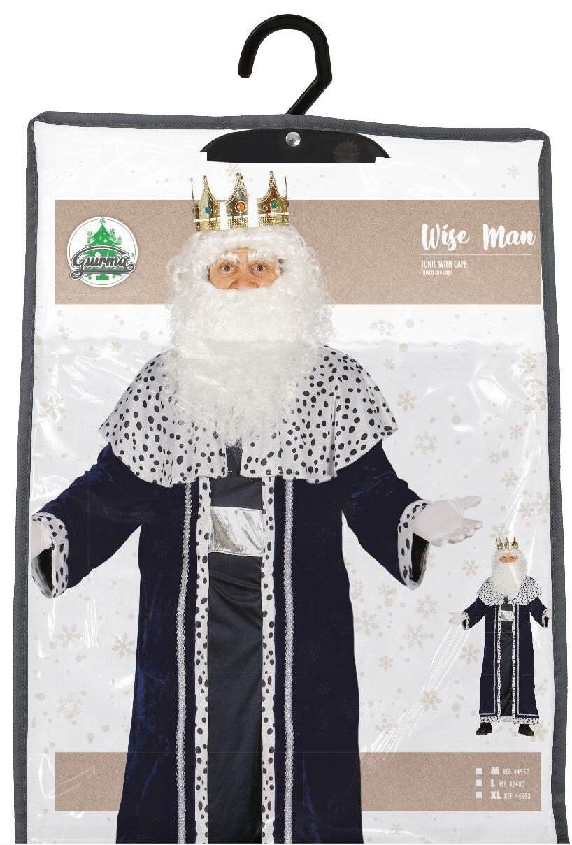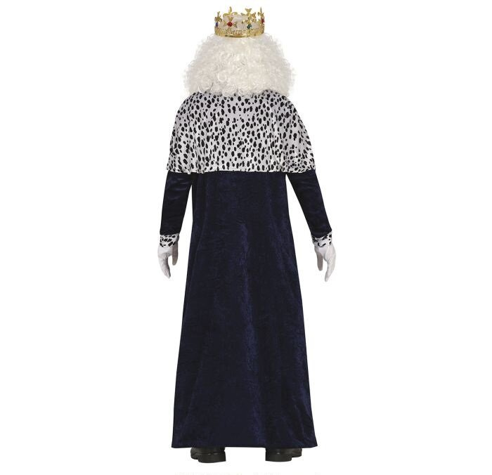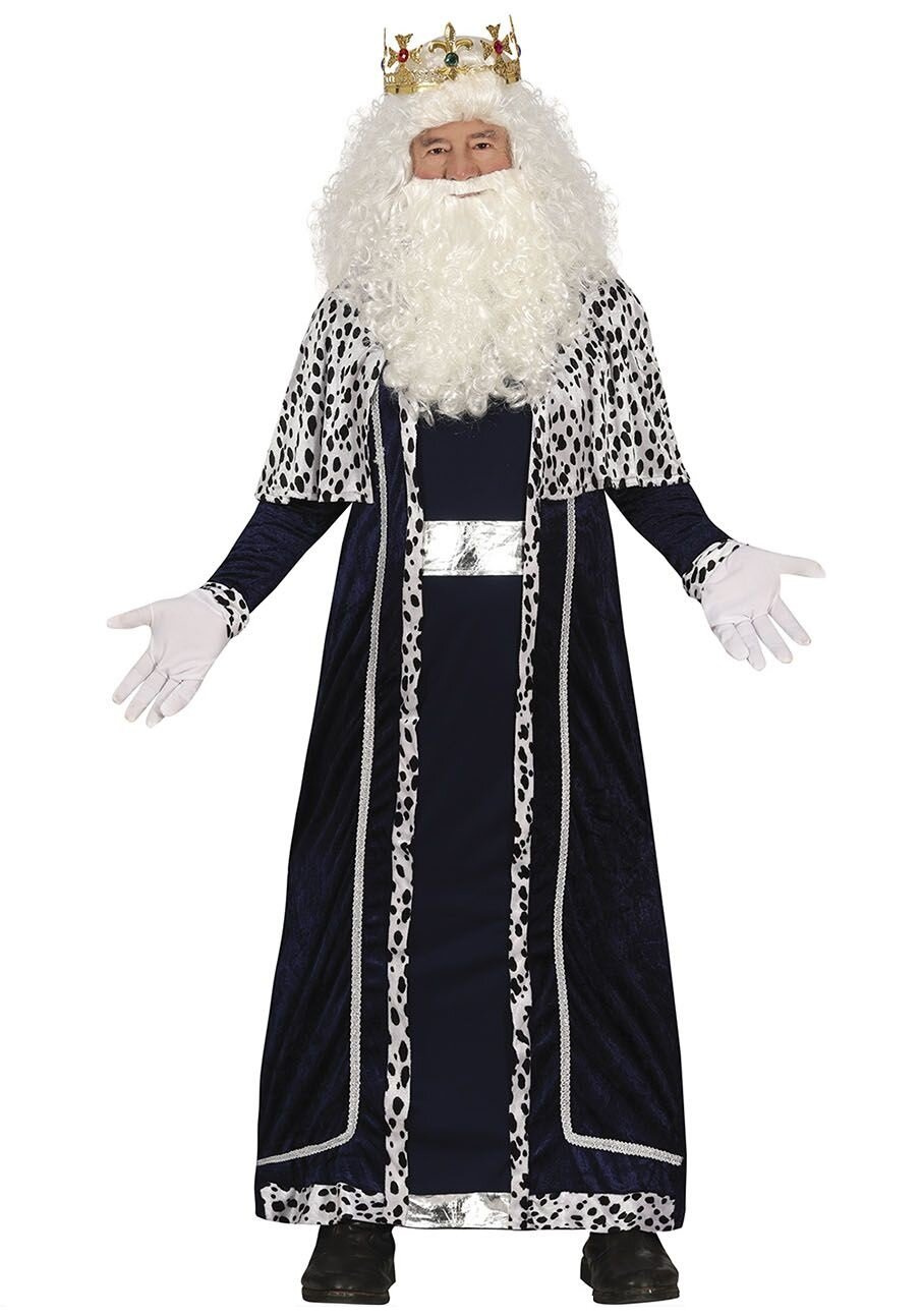 Królewska szata idealna na przedstawienia podczas jasełek jak i bale karnawałowe. W zestawie welurowa długa tunika z kołnierzem - peleryną za ramiona. Szata jest w ciemnogranatowym kolorze, zdobiona srebrnymi lamówkami, które biegną wzdłuż przodu stroju. Peleryna posiada wzór przypominający futro dalmatyńczyka – biały materiał w czarne plamki, co nadaje kostiumowi królewskiego charakteru. Ubranie posiada imitację szerokiego, srebrnego pasa. Uszyta tak, że imituję rozpinany płaszcz. Wiązana na karku.