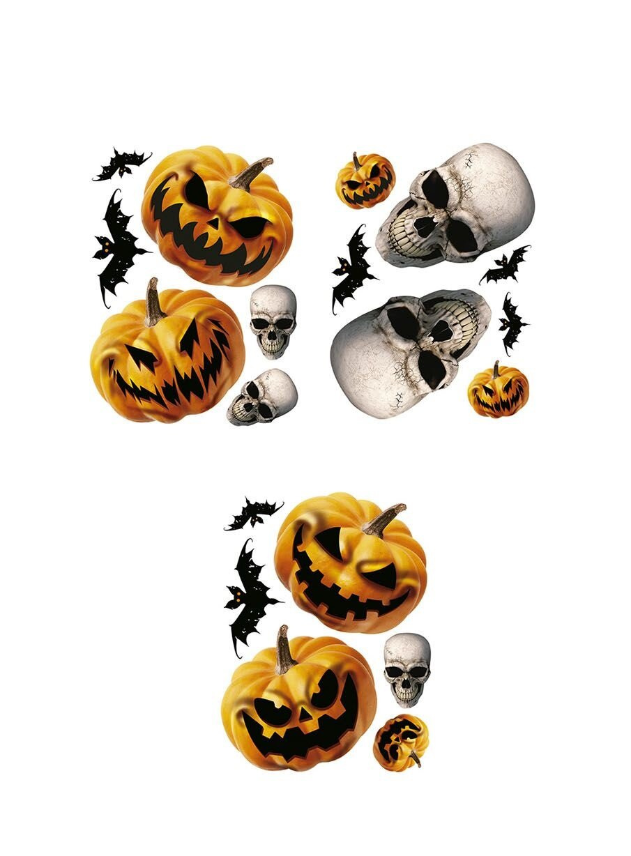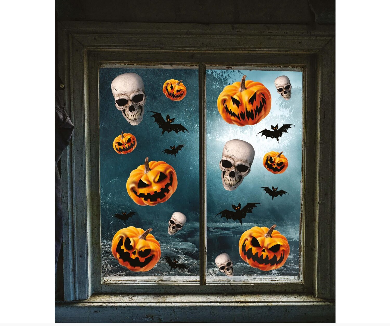 Dekoracja na Halloween i każde horror przyjęcie. Naklejka wykonana jest z tworzywa, prezentuje motywy Halloweenowe: dynie, nietoperze, czaszki. Wszsystkie elementy stylizowane w upiornym stylu, który nadaje grozy. Naklejki są w różnych wielkościach.