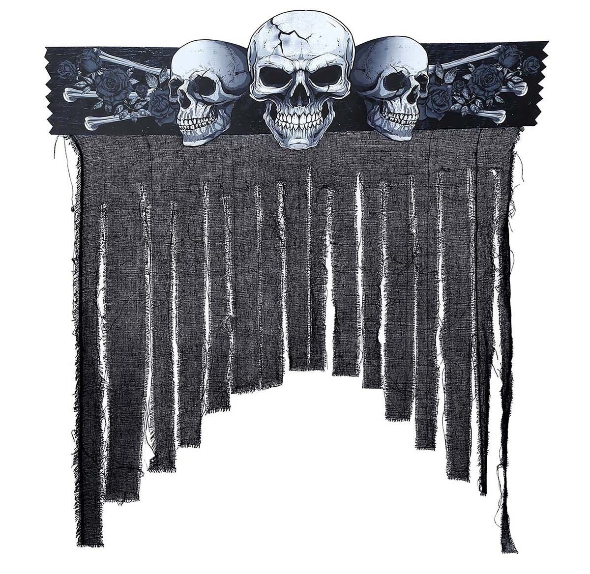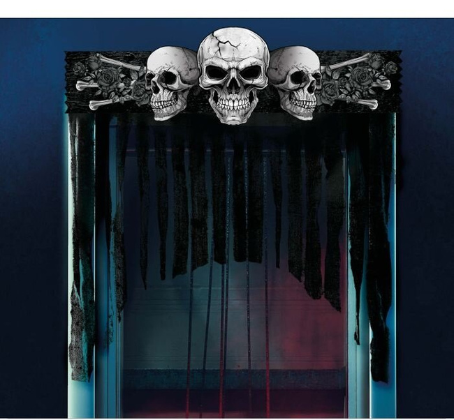 Kurtyna dekoracyjna ozdobiona trzema czaszkami, które umieszczone są na górnej części ozdoby. Każda czaszka ma dość realistycznie i szczegółowo wykonane rysy przez co wygląda groźnie, a dekoracja nabiera mrocznego charakteru. W tle czaszek widać róże i kości, co wzmacnia gotycki styl dekoracji. Pod czaszkami zwisają postrzępione paski czarnego materiału, który imituje zniszczoną tkaninę. Paski materiału są luźno zawieszone, co sprawia, że dekoracja wygląda przerażająco i efektownie porusza się na wietrze. Kurtyna sprawdzi się np. nad drzwiami, oknem lub jako element dekoracyjny na ścianie np w foto budce. Dekoracja idealna na Halloween i każde gotyckie przyjęcia, zwłaszcza w cmentarnym stylu.