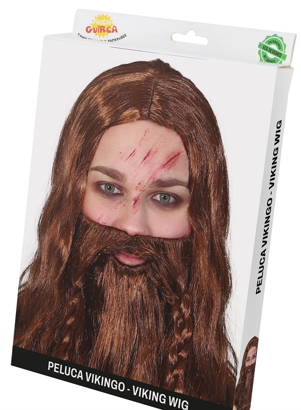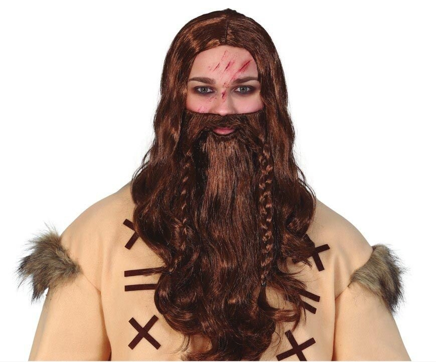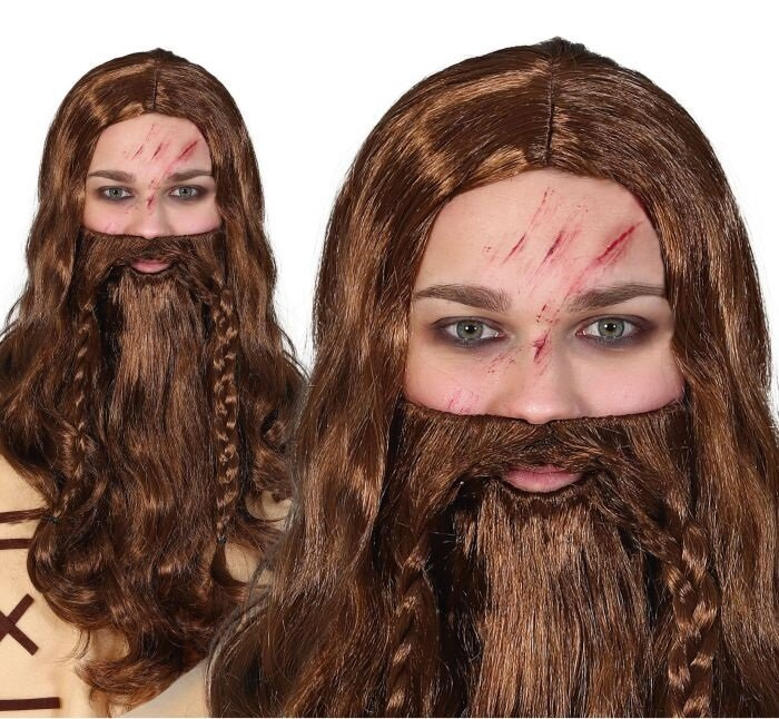 • Peruka z brązowymi włosami lekko pofalowanymi, fryzura z przedziałkiem. W zestawie z długą brodą oraz wąsami zaczesanymi w warkocze. Znakomite dopełnienie charakteryzacji wikinga, grubianina czy Zeusa.