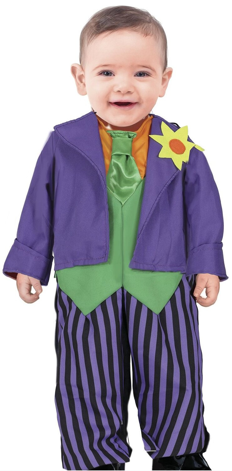 Kostium podstępnego Jokera, wesołego klauna, gangstera lub odważny strój eleganta na przebieraną imprezę w stylu filmowe postacie czy Halloween. Przebranie przedstawia stylizację inspirowaną komiksową postacią złoczyńcy. Przebranie składa się z jednoczęściowego kombinezonu z długim rękawem i nogawkami. Utrzymany w kolorach fioletowym, zielonym i pomarańczowym, składa się z marynarki z wszytą koszulą, kamizelką oraz krawatem. Fioletowe spodnie w czarne pionowe paski dopełniają całość, nadając kombinezonowi charakterystyczny wygląd. Na lewej klapie marynarki znajduje się dekoracyjny kwiat, który jest typowym elementem stroju klauna. Kombinezon posiada z tyłu zapięcie na rzep. W kroku całościowe rozpięcie na rzep, dzięki któremu łatwiej zmienić pieluszkę.