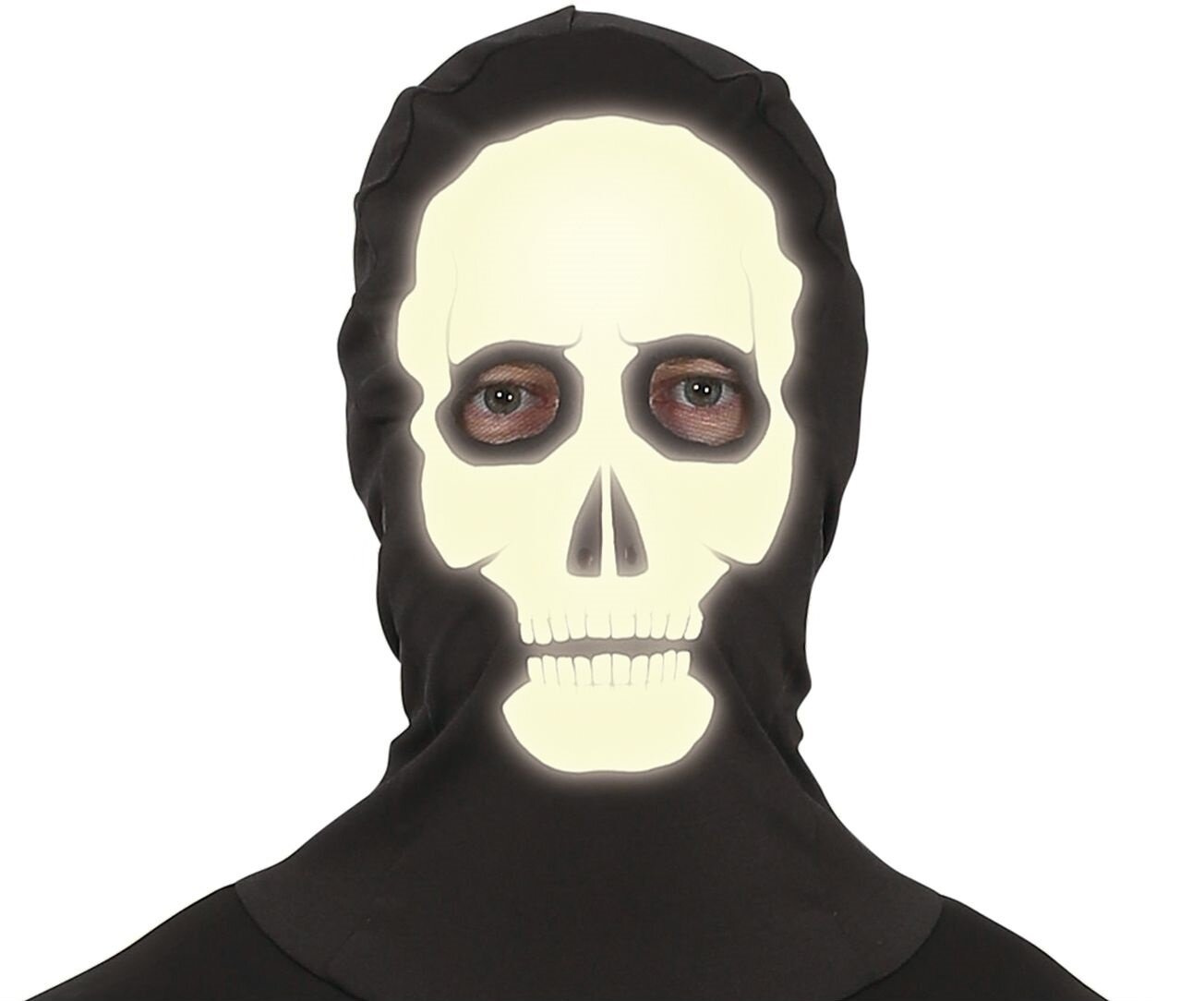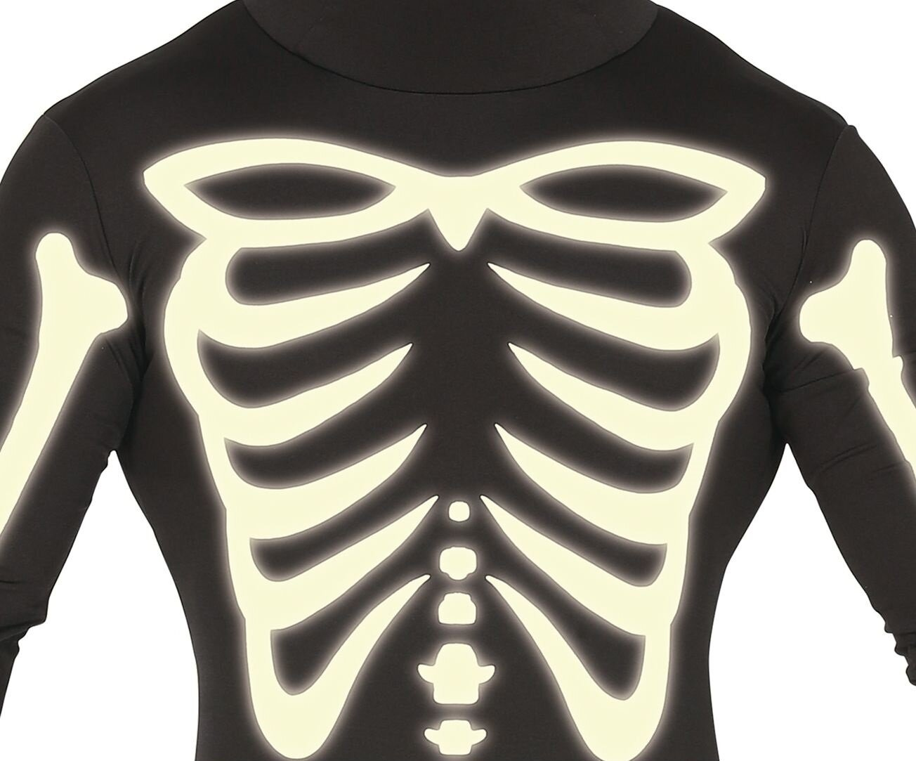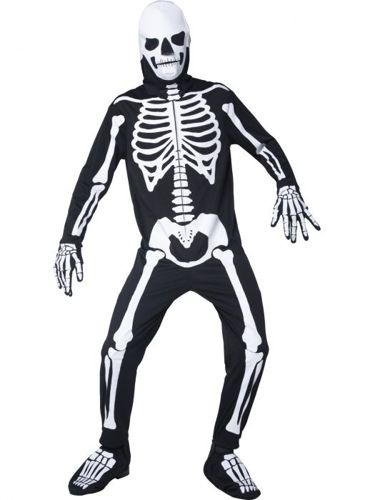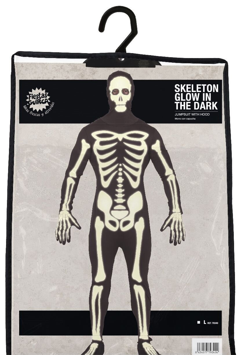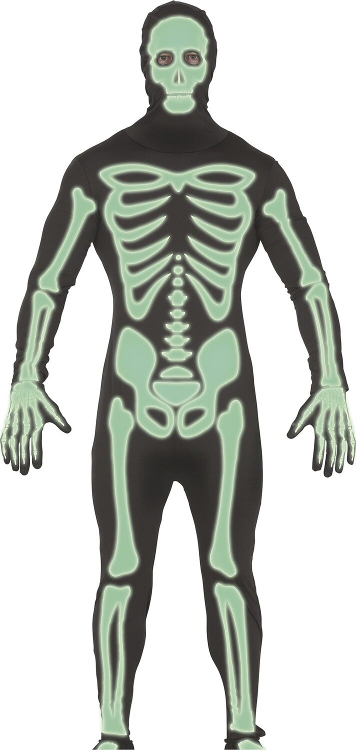 Jednoczęściowy kostium w kształcie szkieletu, który świeci w ciemności. Jest to strój idealny na Halloween lub inne imprezy kostiumowe. Ciemny kombinezon z nadrukiem kości obejmuje całe ciało, w tym głowę. Nie posiada otworów na oczy, nos, ani usta, mimo to posiada ograniczoną widoczność. Nadruk jest fluorescencyjny, co oznacza, że po naświetleniu, elementy w kształcie kości emitują blask w ciemności, tworząc efekt "świecącego szkieletu". Przebranie składa się z jednoczęściowego kombinezonu z długimi rękawami i nogawkami. Nadruk żeber, miednicy, kręgosłupa oraz kości kończyn jedynie jest od przodu, tył całkowicie gładki. Zapinany z tyłu na zamek błyskawiczny łącznie z kapturem.