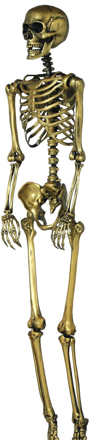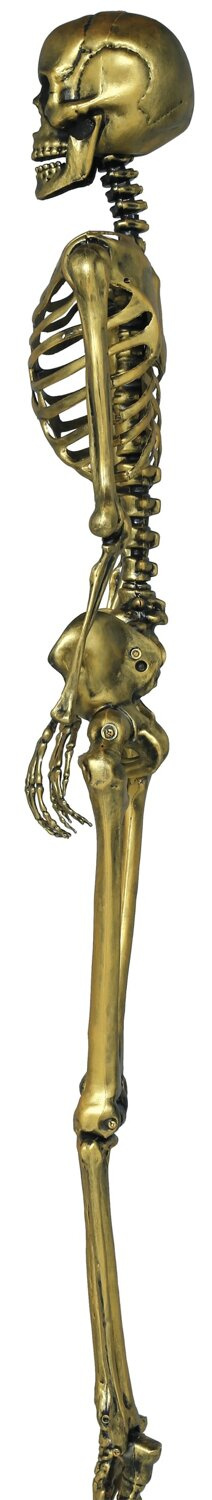 Trójwymiarowy szkielet człowieka do dekoracji na Halloween. Szkielet jest anatomicznie odwzorowany, z wyraźnymi kośćmi, takimi jak czaszka, żebra, miednica i kończyny. Szkielet wykonany z tworzywa, posiada ruchome nogi, ręce, stawy, głowę oraz żuchwę - dzięki czemu można nadać mu różne pozycje, np siedzącą, z nogą założoną na nogę itp. Stylizowany na stare, przybrudzone złoto, niczym dotknięty przez Midasa lub jako część pirackiego skarbu.
