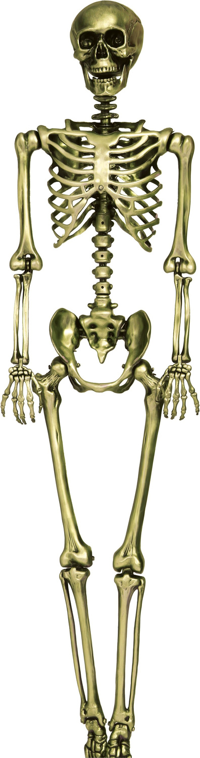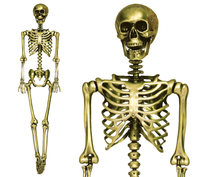 - Trójwymiarowy szkielet człowieka do dekoracji na Halloween. Szkielet wykonany z tworzywa, posiada ruchome elementy. Stylizowany na stare, przybrudzone złoto. Może być zawieszony lub usadzony w różnych pozach.