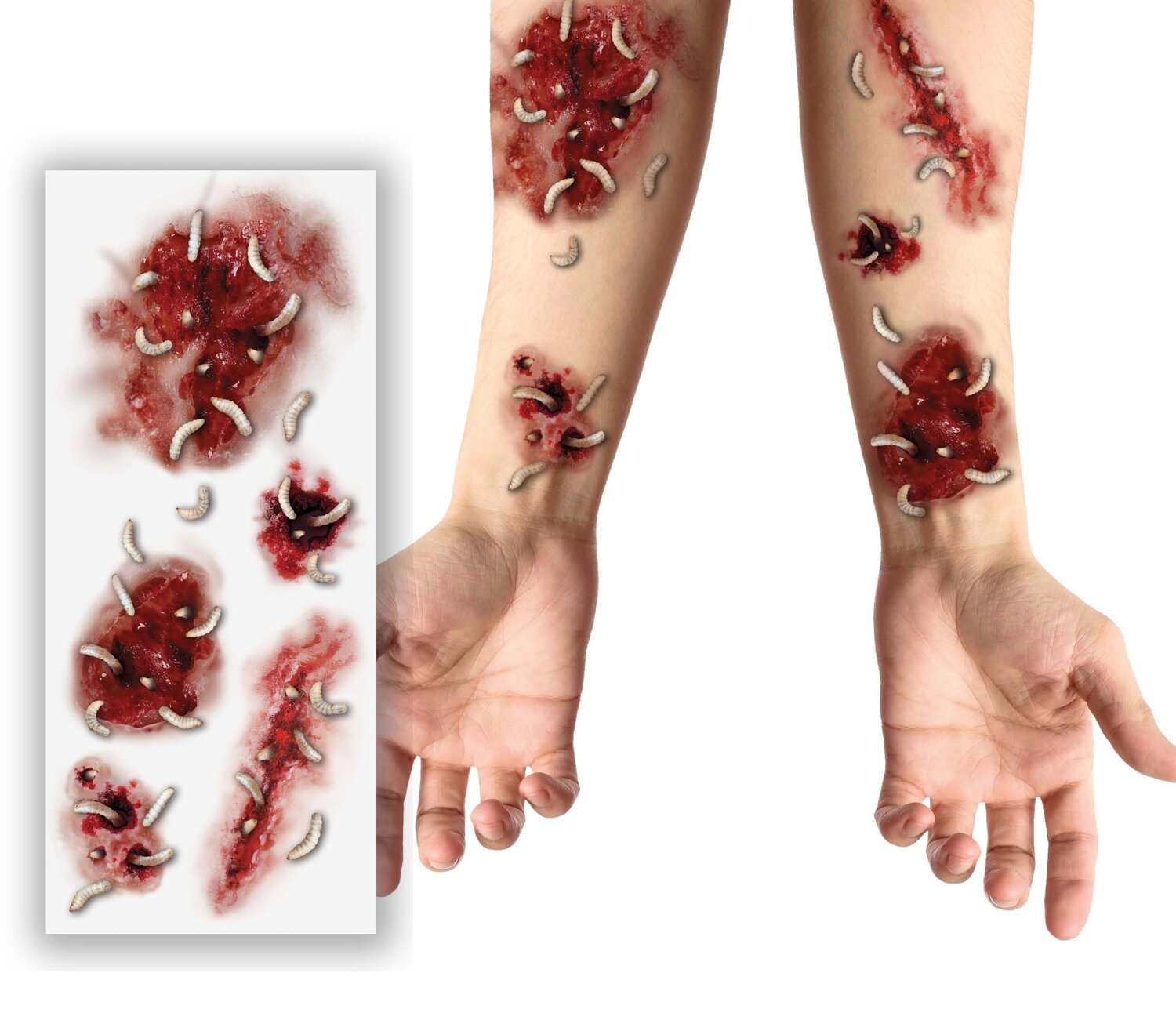 - Zestaw tatuaży, które prezentują różnego rodzaju rany z owrzodzeniem z których wychodzą robaki. Zestaw zawiera 5 dość dużych ran w różnych rozmiarach.