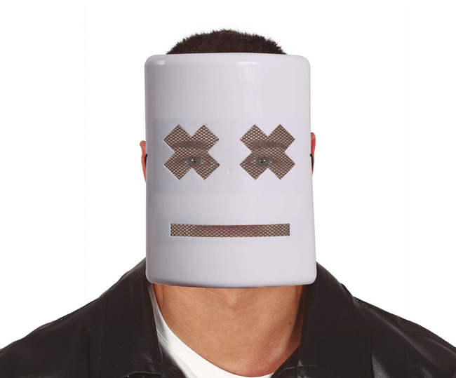 Prosta, biała maska, z charakterystycznymi elementami: dwa duże, ciemne „X” zamiast oczu oraz prostą linią symbolizującą usta. Maska ma minimalistyczny, futurystyczny wygląd, przypominający styl, który można skojarzyć z artystą muzycznym Marshmello, który jest znany ze swojego wizerunku, w którym nosi białą maskę z podobnym wzorem. Maska ma również siateczkowe wstawki w miejscach oczu i ust, które zapewniają widoczność i oddychalność dla noszącego. Maska mocowana jest na gumce, nie zakrywa tyłu głowy. Jest to popularny motyw związany z elektroniczną muzyką taneczną i cosplayem,.