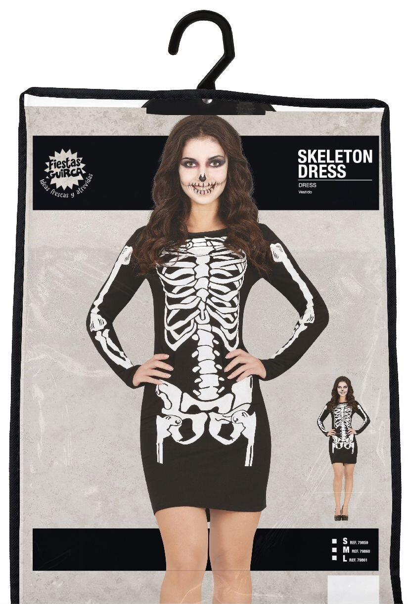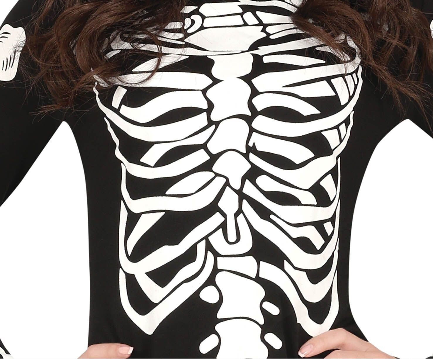 Czarna sukienka z długim rękawem przedstawia motyw szkieletu. Sukienka ma prosty, przylegający krój, a jej długość sięga przed kolano. Nadruk biegnie przez całą długość sukienki, od ramion po biodra i przedstawia anatomiczne kontury kości: żeber, kręgosłupa oraz miednicy, nadając sukience efektownego i przerażającego wyglądu. Długie rękawy również mają nadruk kości, co dopełnia całościowy efekt szkieletu.