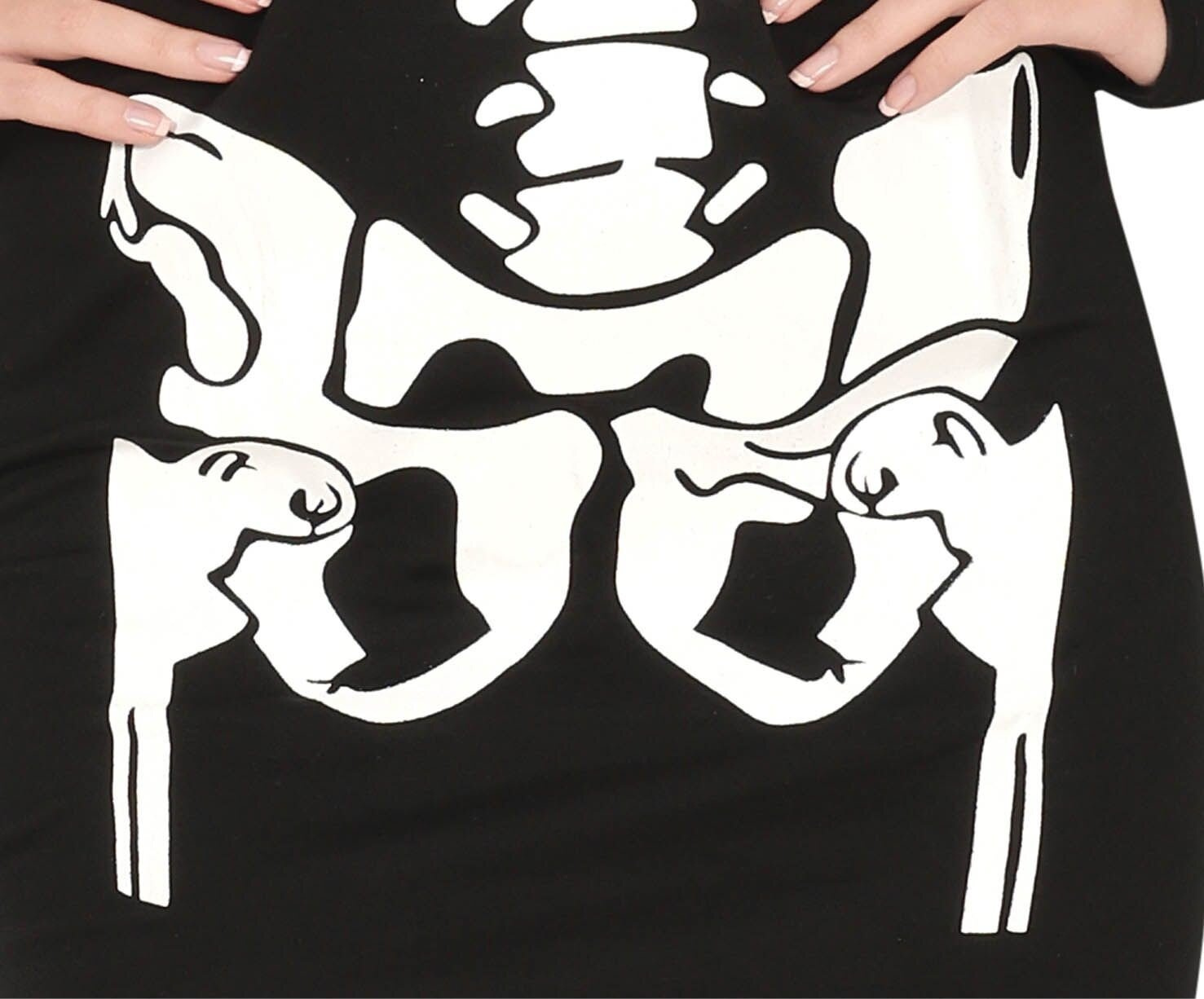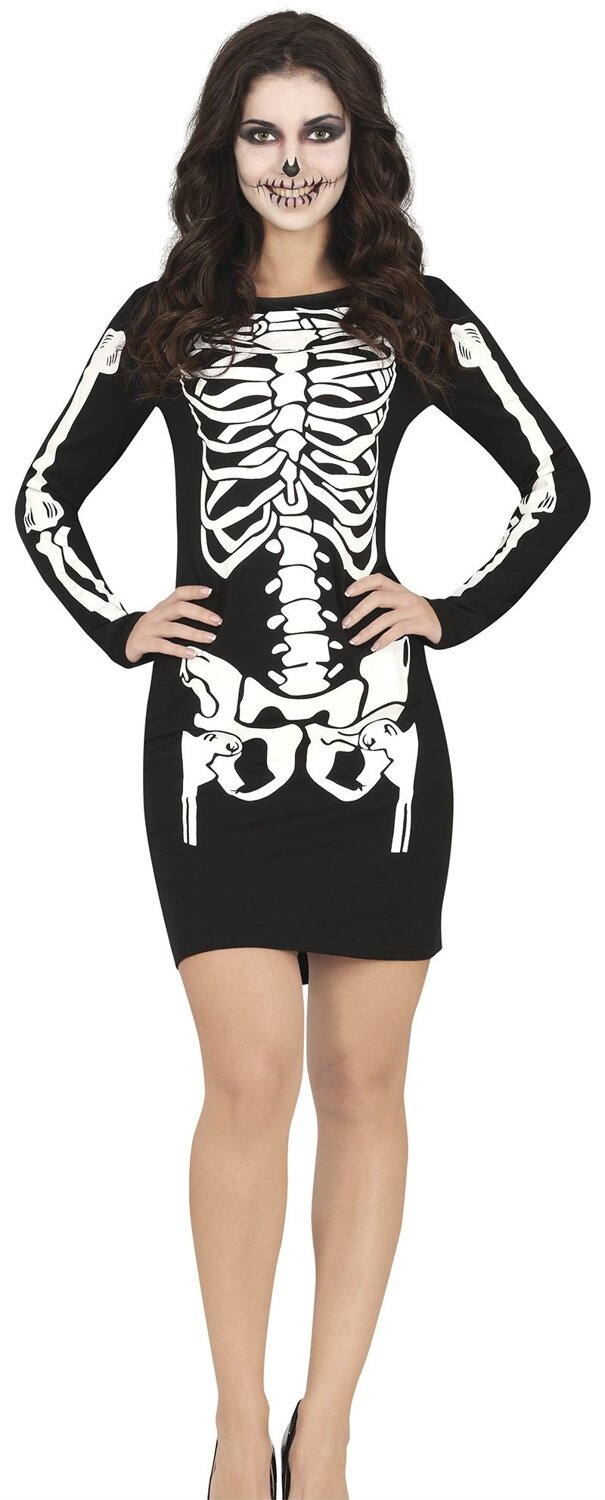 - Czarna sukienka z długim rękawem przedstawia motyw szkieletu, który widoczny jest na przedniej części stroju oraz na rękawach. Krój prosty, dopasowany.