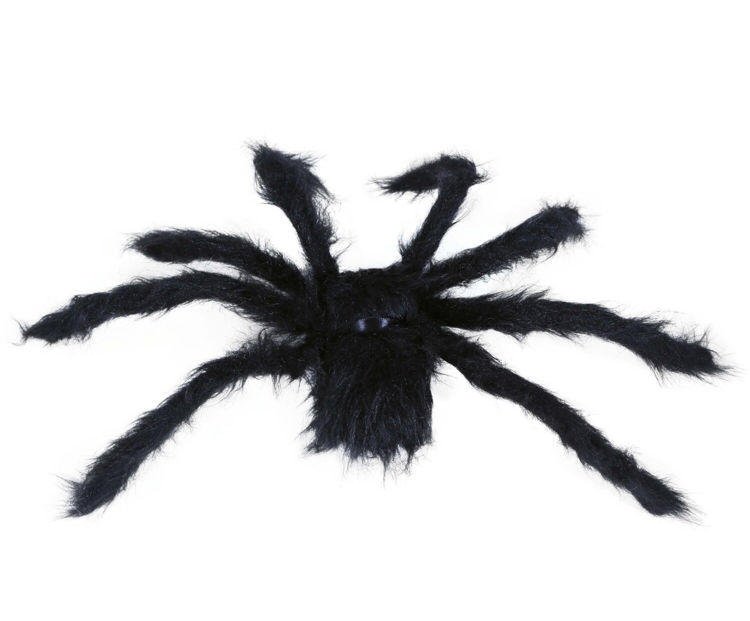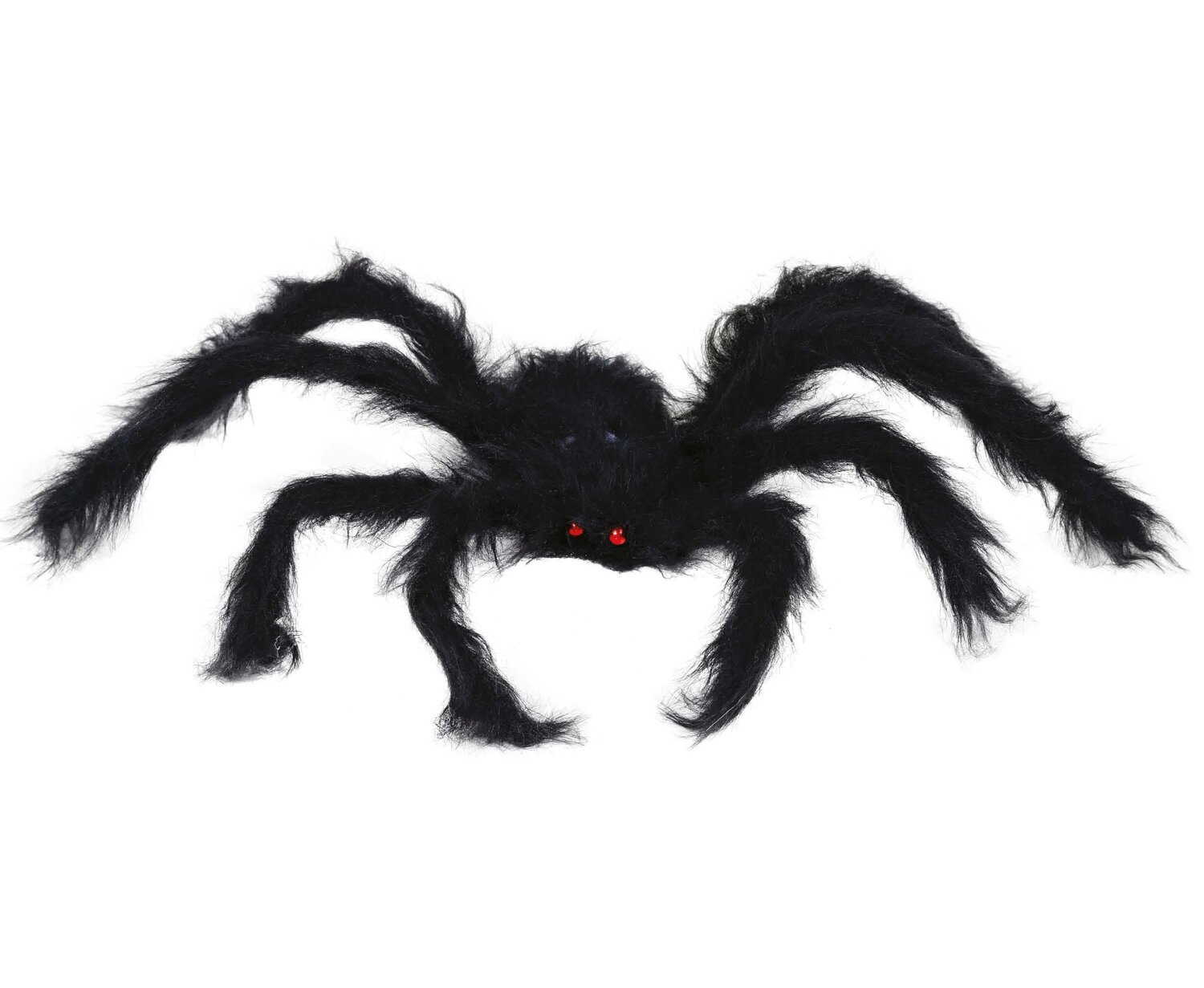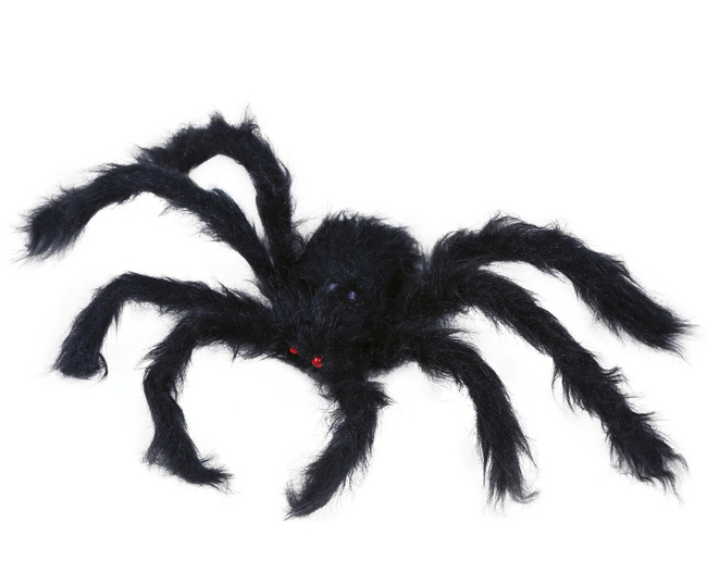 Dekoracja w kształcie pająka. Pająk ma czarne futro oraz czerwone oczy, co nadaje mu efektowny, przerażający wygląd, idealny na Halloween lub inne imprezy tematyczne. Długie, rozłożyste nogi i futrzana tekstura dodają mu realizmu, a ciemny kolor przyciąga uwagę. W kończynach umieszczone zostały druciki, które pozwalają dowolnie formować pająka. To świetna ozdoba, która może być zawieszona lub postawiona w różnych miejscach, aby stworzyć atmosferę grozy.