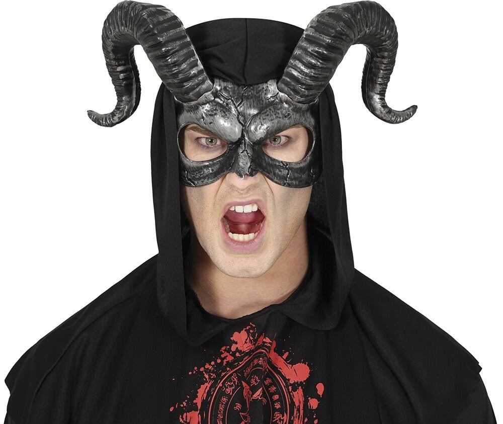 Plastikowa maska inspirowana demonicznym / diabelskim motywem. Maska ma ciemnoszary, niemal metaliczny kolor i jest wyposażona w duże, zakręcone rogi, co nadaje jej groźny i złowieszczy wygląd. Sama maska zakrywa górną część twarzy, a wycięcia na oczy pozwalają na łatwe widzenie. Wzór maski podkreśla mroczną stylistykę, a ostre linie nadają jej drapieżnego wyglądu. Zakręcone, masywne rogi wyrastające z czoła maski są głównym elementem, który przyciąga uwagę. Mają surowy, chropowaty wygląd, przypominający antyczne, kamienne rzeźby. Mocowana na gumce, nie zakrywa tyłu głowy.