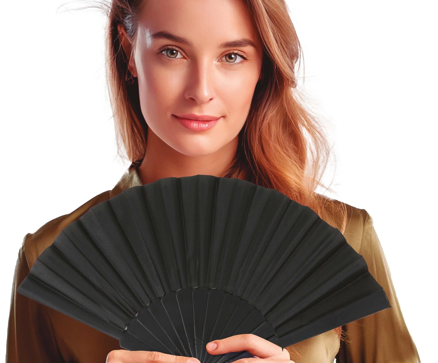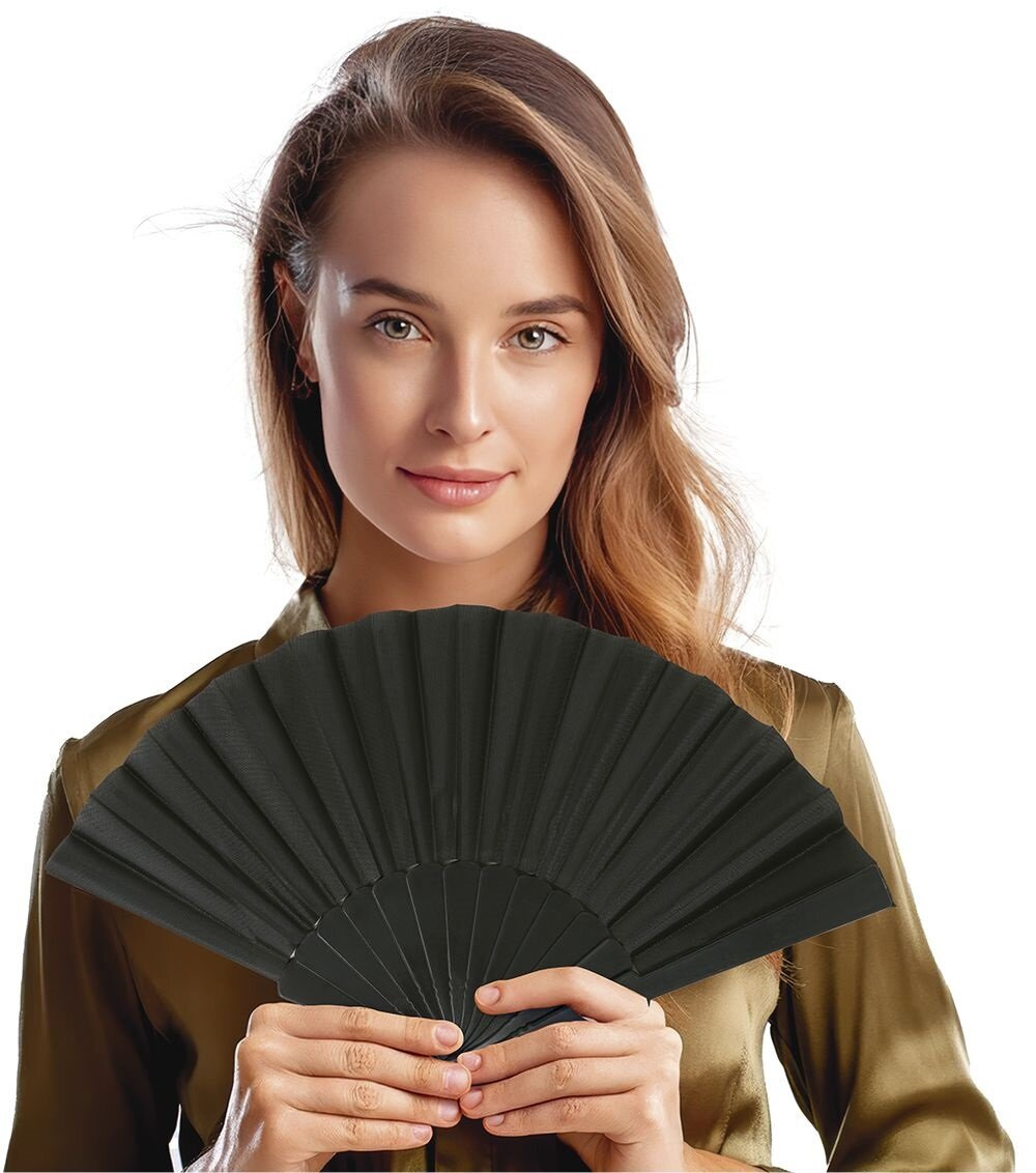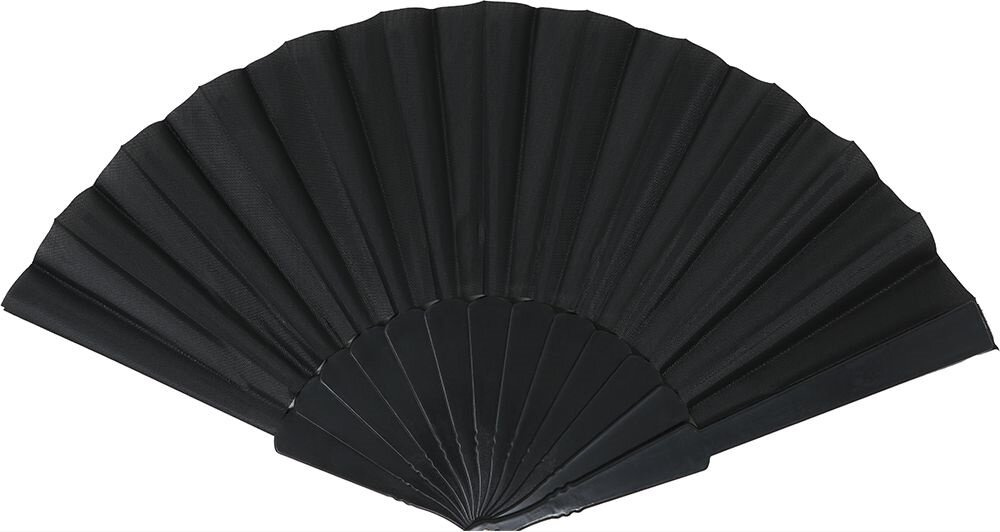 Klasyczny wachlarz, w jednolitym, głębokim czarnym kolorze, co nadaje mu elegancki i tajemniczy wygląd. Składa się z wielu plisowanych skrzydeł, które rozkładają się promieniście, tworząc półkolisty kształt. Dolna część wachlarza to solidna baza, która zapewnia stabilność przy rozkładaniu i składaniu. Wachlarz wykonany z plastiku oraz materiału.