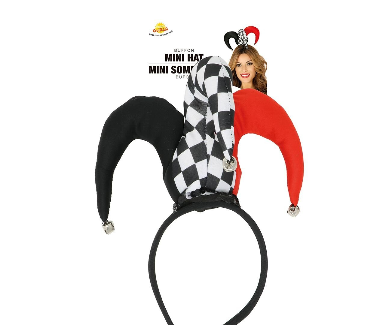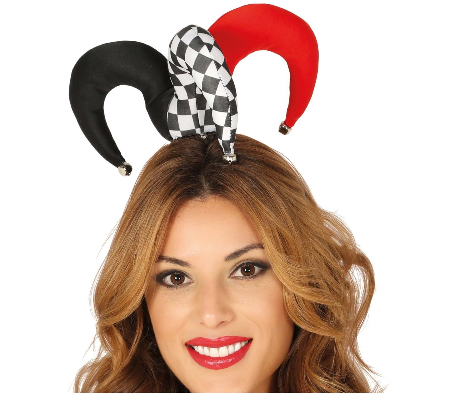 Opaska z charakterystycznymi elementami w stylu błazna, która doskonale sprawdzi się jako dodatek do zabawnych lub karnawałowych stylizacji. Opaska ma trzy zakrzywione rogi, przypominające klasyczną czapkę błazeńską. Każdy z rogów zakończony jest małym dzwoneczkiem, który dzwoni przy ruchu, dodając dynamiki. Rogi mają różne wzory i kolory – jeden jest czerwony, drugi czarny, a trzeci w biało-czarną szachownicę. Taki kontrast przyciąga wzrok i nawiązuje do tradycyjnych, teatralnych stylizacji królewskich klaunów. Rogi są miękkie, co sprawia, że są wygodne do noszenia i jednocześnie nadają całości lekko zabawny wygląd. Czapeczka umieszczona została na opasce obszytej czarnym materiałem.