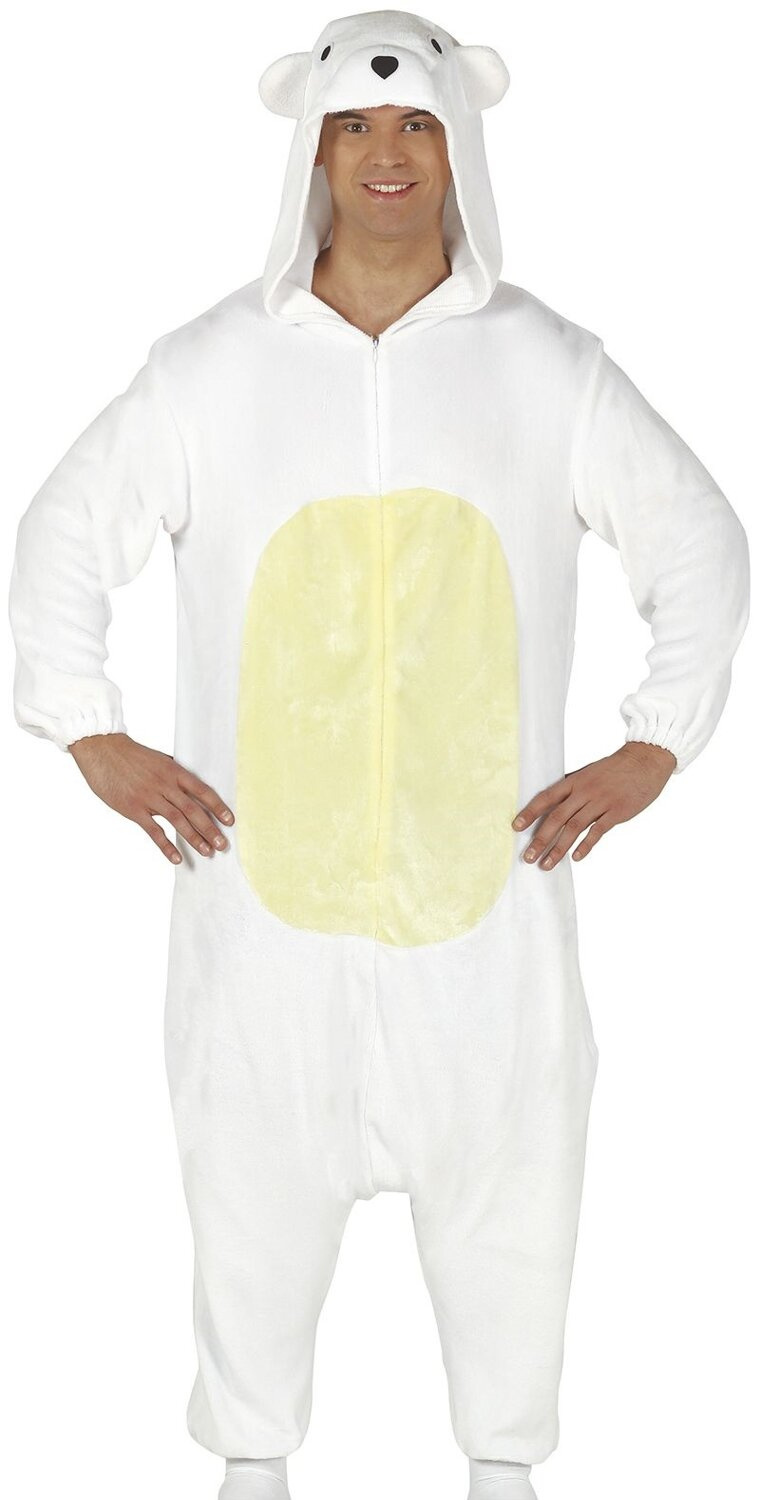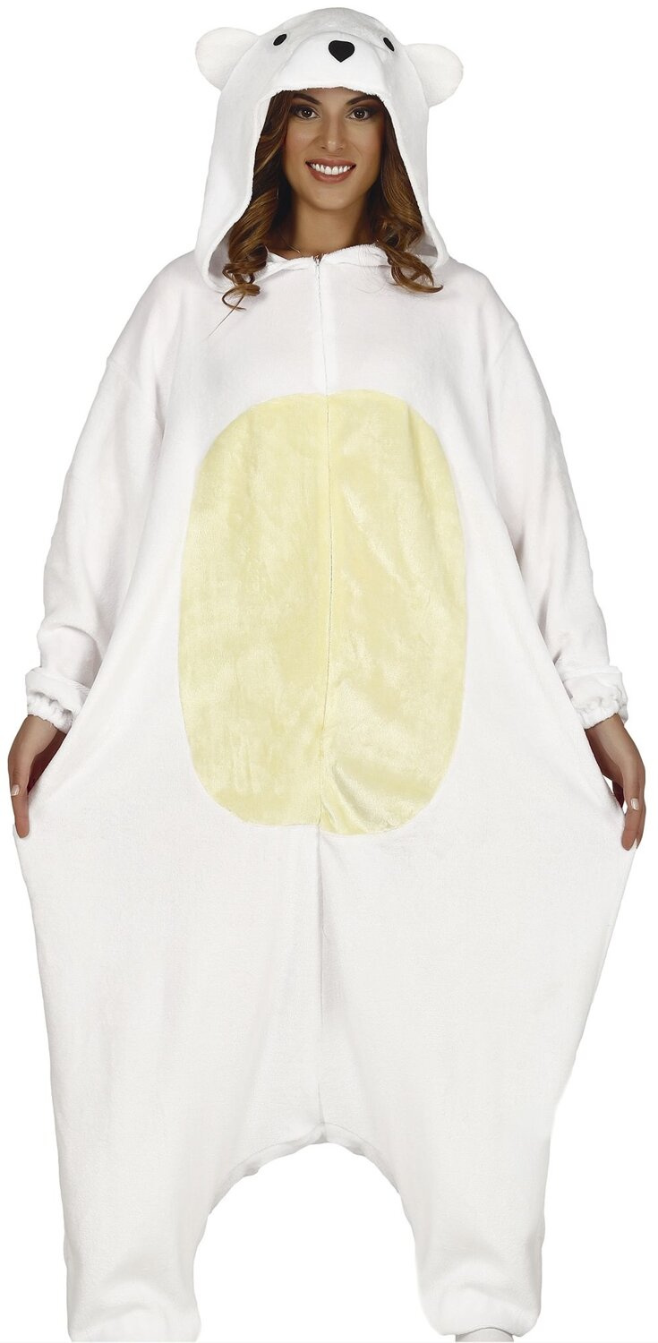 Jednoczęściowy kombinezon misia polarnego z kapturem w stylu kigurumimi. Wykonany z miłego w dotyku, białego materiału. Zapinany z przodu na suwak, na przodzie żółta wszywka nawiązująca do brzuszka. Mankiety i nogawki wykończone gumką. Do kaptura doszyte są uszy oraz naszywki oczu i noska.