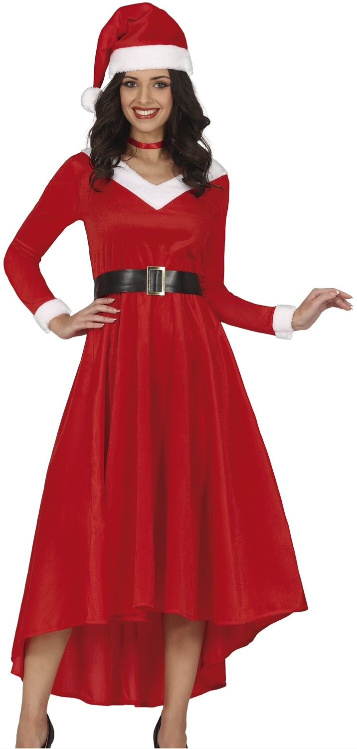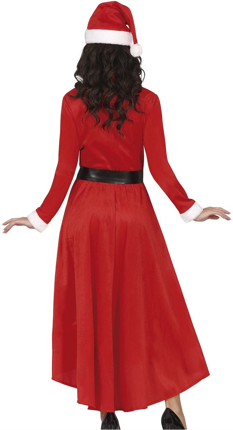 Klasyczny kostium Mikołajki, składający się z eleganckiej czerwonej sukni z długimi rękawami oraz czapką Mikołaja. Suknia ma charakterystyczne białe futerko na mankietach, dekolcie oraz asymetryczny dół, który dodaje lekkości i elegancji. W talii gumka dla lepszego dopasowania do figury. Dodatkowo w zestawie znajduje się czarny pasek z dużą, złotą klamrą, podkreślający figurę. Pas zapinany na rzep z regulacją.