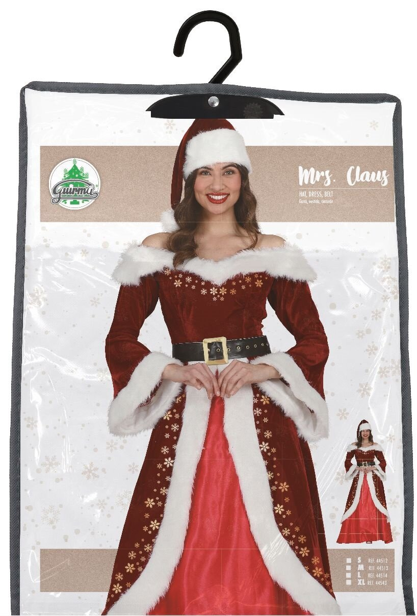 Elegancki kostium Mikołajki w sam raz dla Mamy - Pani Mikołajowej. Suknia wykonana z ciemnoczerwonego materiału o aksamitnym wykończeniu na torsie, rękawach i falbanie spódnicy. Sama spódnica uszyta z satynowego materiału w jaśniejszym odcieniu czerwonego. Suknia na dekolcie oraz falbanie spódnicy posiada ozdobne, złote śnieżynki. Futerko w białym kolorze zdobi dekolt w stylu hiszpańskim - z odsłoniętymi ramionami, rękawy i przód sukni, nadając jej świątecznego charakteru. Sukienka posiada w pasie wszytą gumkę dla lepszego dopasowania do figury. Czarny pasek z dużą, złotą klamrą akcentuje talię, a dopasowana czapka Świętego Mikołaja z białym futerkiem dopełnia całość.