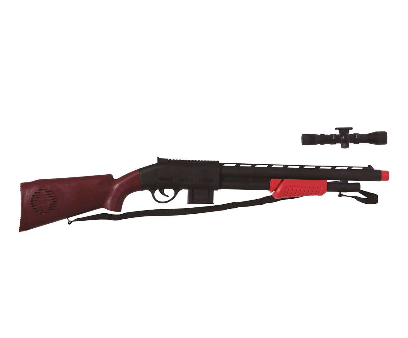 Zabawkowa strzelba, przypominająca strzelbę typu pump-action. Karabin wykonany jest z plastiku, ma brązową kolbę i czerwony przedni chwyt, który imituję broń przeładunkową. Strzelba wyposażona jest w demontowalny celownik optyczny na górze (imitacja). Broń posiada pasek na ramię, co ułatwia jej przenoszenie. Posiada ruchomy spust, który po naciśnięciu wydaje odgłos pojedynczego huku.