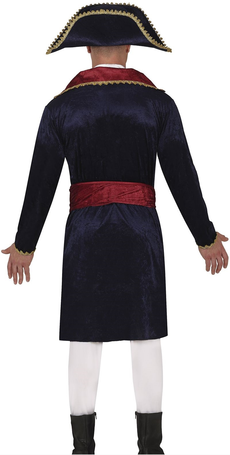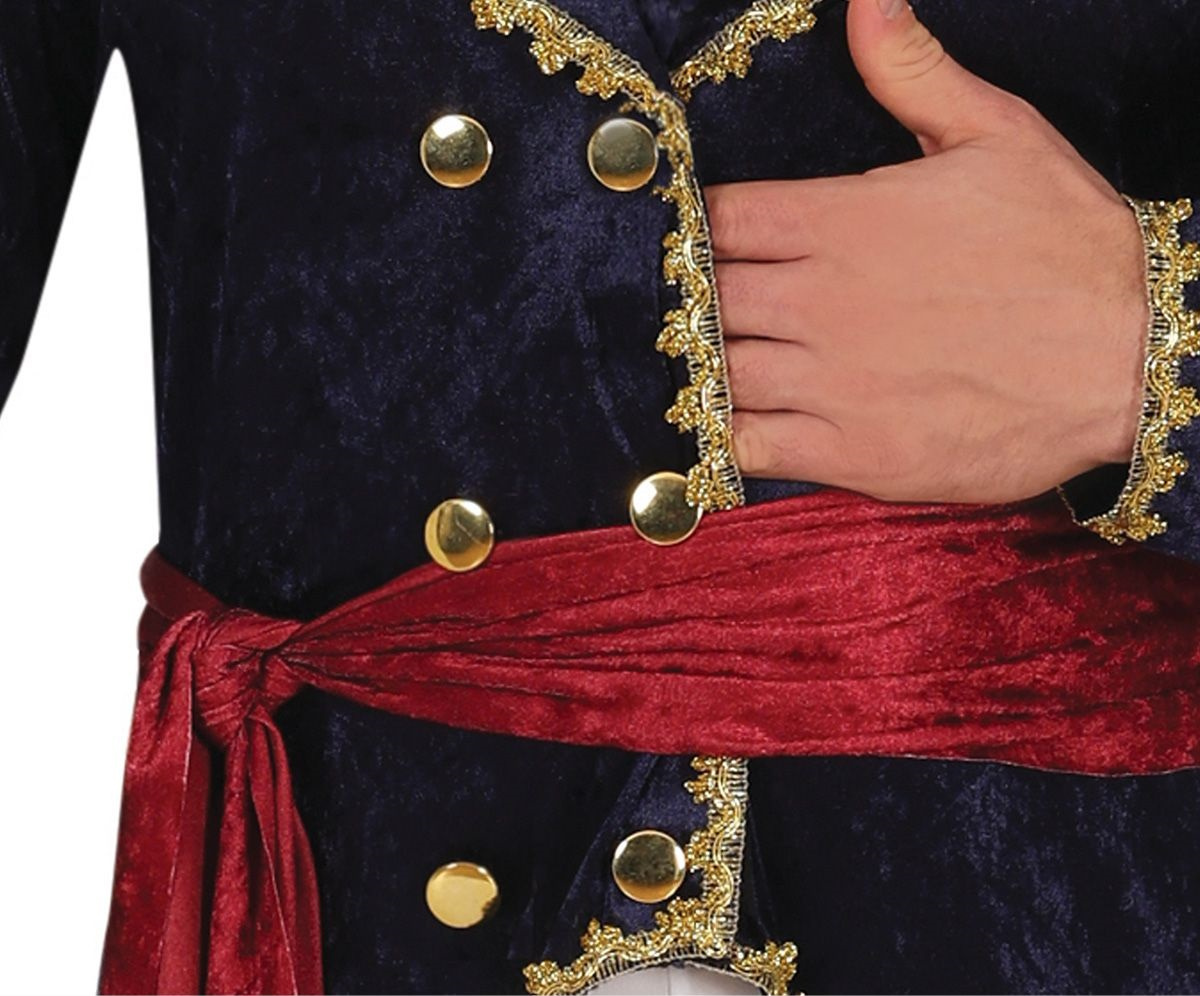 Strój inspirowany epoką napoleońską, mający charakter oficerski lub generalski. Przebranie składa się z marynarki z długim rękawem, spodni oraz czapki. Długi granatowy płaszcz z aksamitnego materiału wykończony jest złotymi haftami na krawędziach oraz przy mankietach, co nadaje mu elegancji i stylu z epoki. Złote guziki z przodu podkreślają militarny charakter stroju. Guziki są jedynie imitacją, płaszcz zapinany jest na rzepy. Kołnierz ma czerwone akcenty, co wyróżnia płaszcz i dodaje mu kontrastu. Spodnie białe, typowe dla oficjalnego ubioru wojskowego tamtej epoki. Posiadają gumkę w pasie dla lepszego dopasowania do figury. Przebranie uzupełnia biały, satynowy żabot - zapinany na karku na rzep, aksamitny czerwony pas do wiązania oraz granatowy, aksamitny kapelusz. Nakrycie głowy jest ozdobione złotymi detalami na brzegach oraz posiada nadruk z motywem kolorystycznym, który symbolizuje order lub rangę żołnierza.