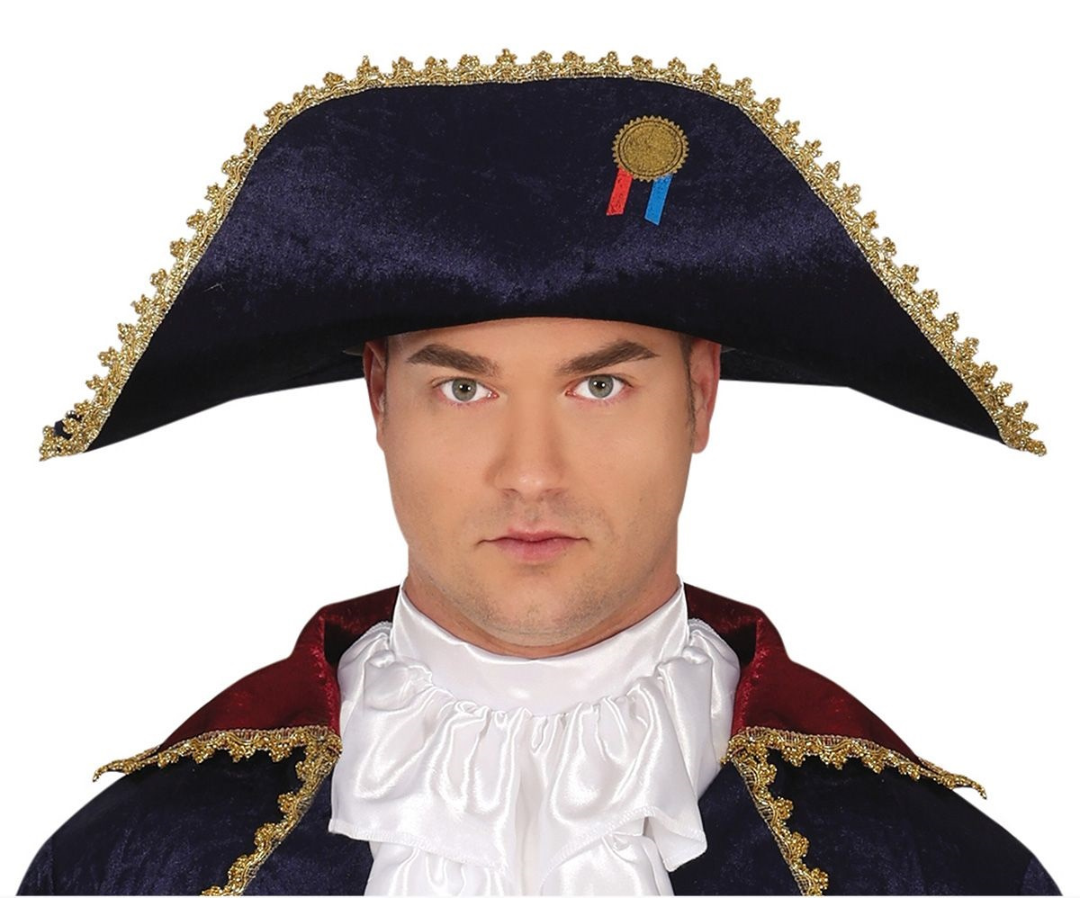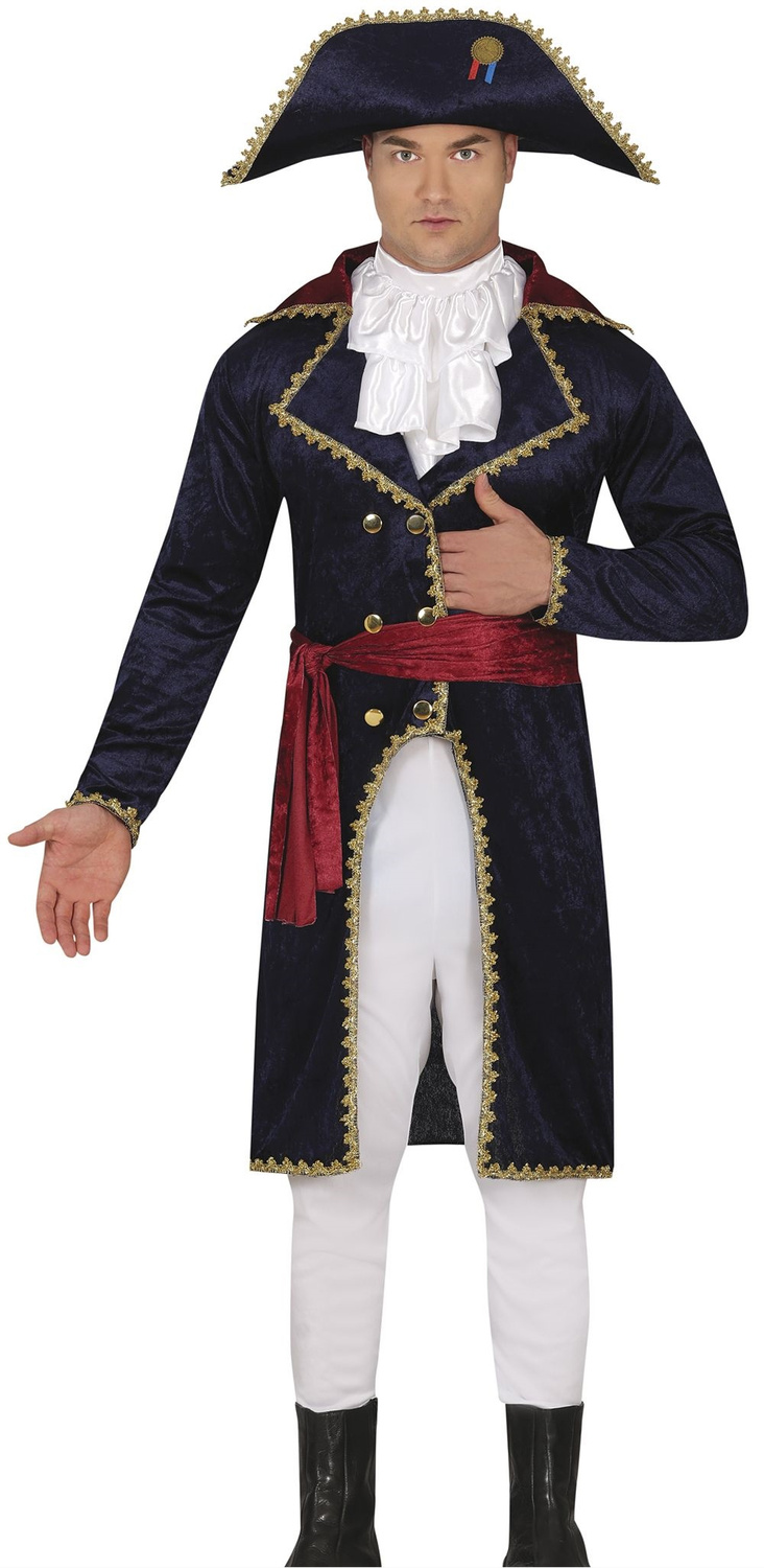 - Mundur wojskowego oficera z historycznych czasów napoleońskich. Wykonany biało - granatowym kolorze z bordowymi dodatkami. W zestawie: płaszcz, żabot spodnie, pas, kapelusz.