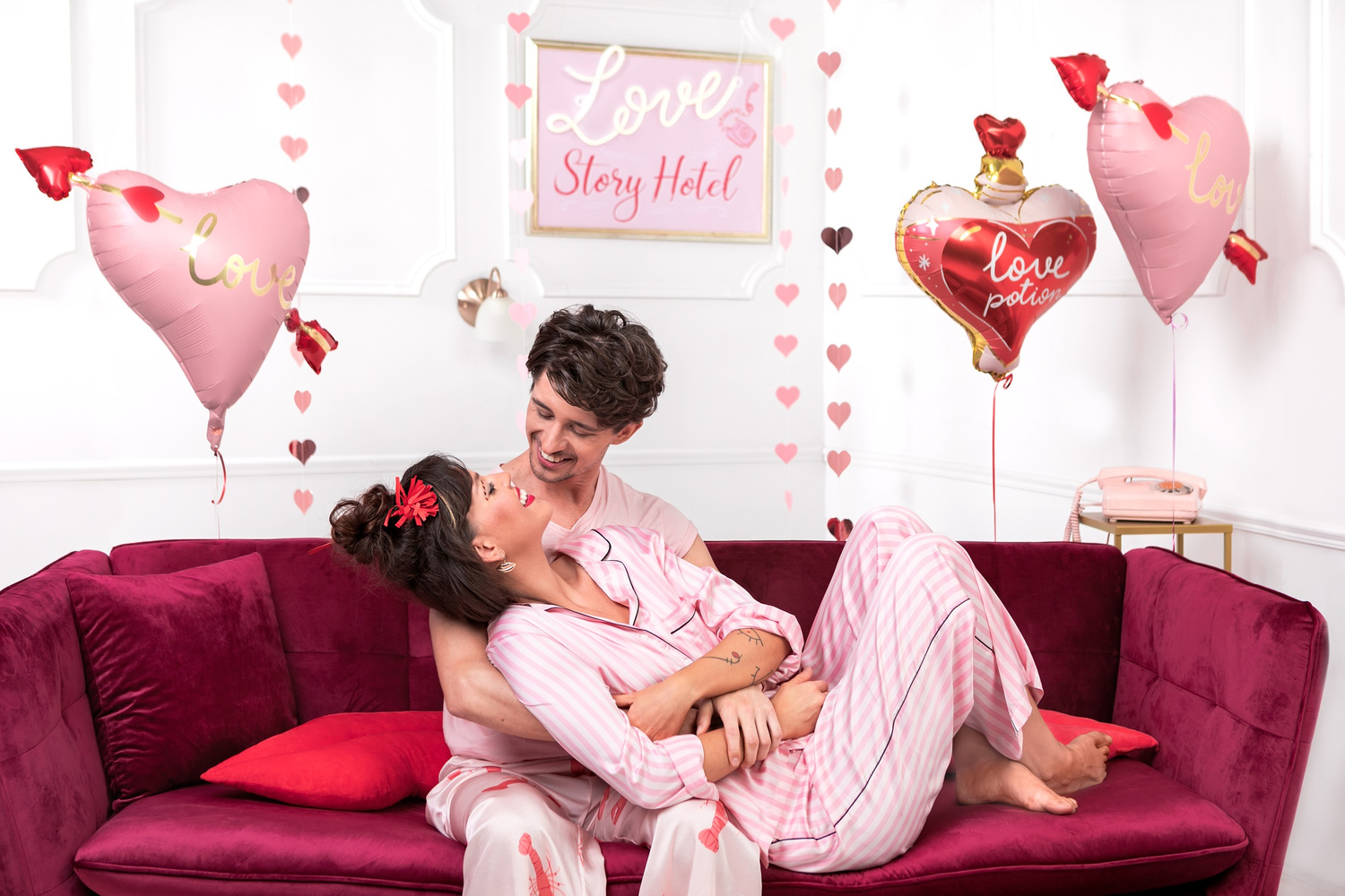 - Balon foliowy w kształcie serca ozdobiony strzałą Amora oraz złotym napisem LOVE. Balon jest w ciemnoróżowym kolorze. Idealny do dekoracji na wiele romantycznych okazji. Balon do napełniania helem lub powietrzem.