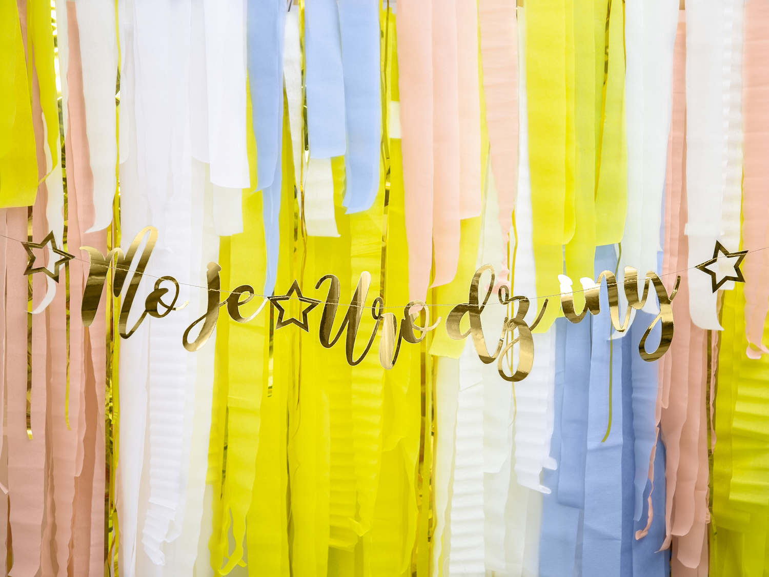 Pozioma girlanda tekturowa tworząca napis "Moje Urodziny". Ozdoba składa się z połączonych liter w złotym, lustrzanym kolorze, który pięknie połyskuje. Wyrazy rozdzielone są gwiazdami i umieszczone na złotym sznurku. Nadruk jest jednostronny, tył biały.