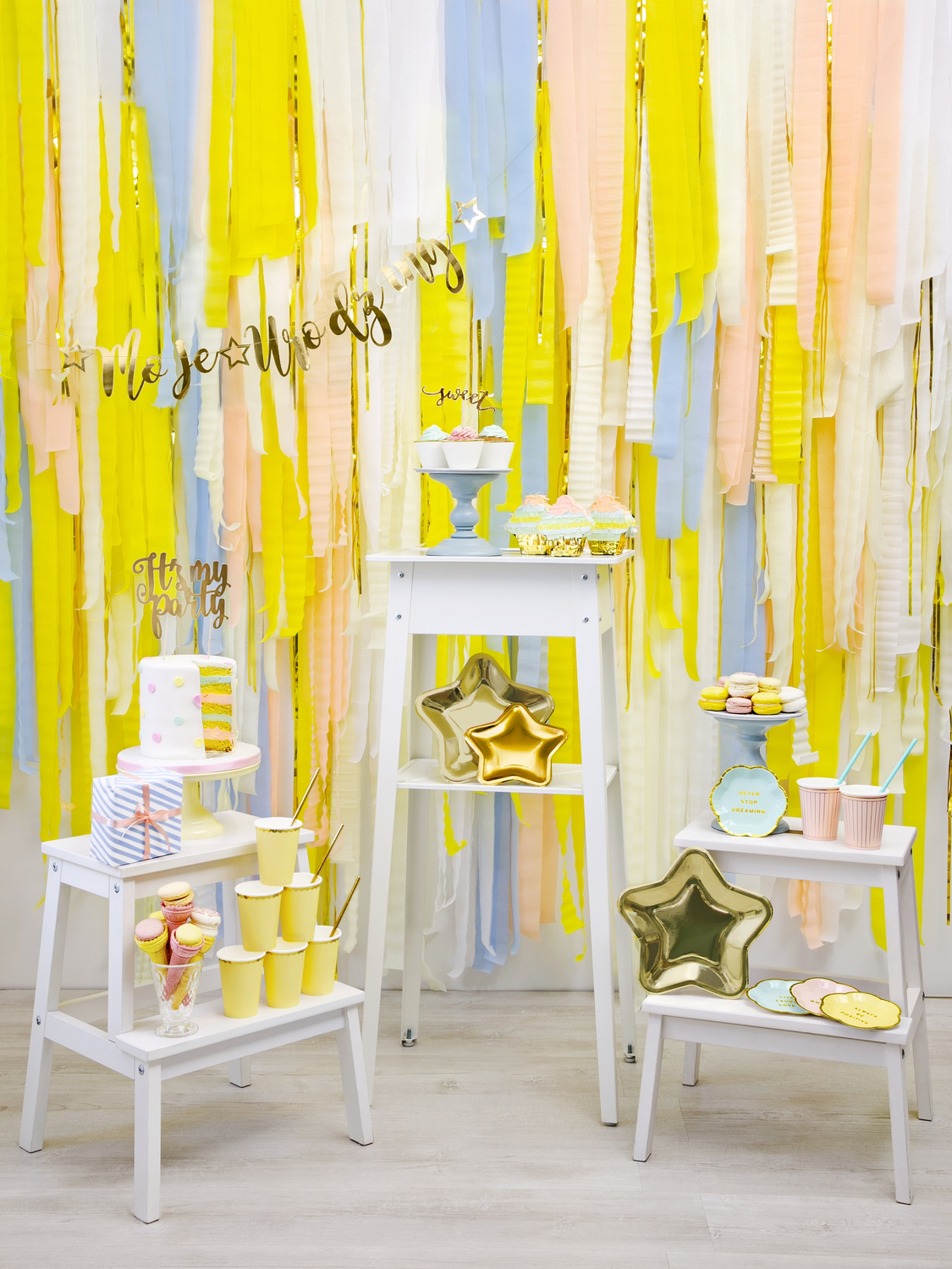 - Girlanda tekturowa złożona z napisu Moje Urodziny. Ozdoba składa się z połyskujących, lustrzanych wyrazów w złotym kolorze. Między wyrazami gwiazdki. Baner stanowi doskonałą dekorację każdego pomieszczenia podczas urodzin.