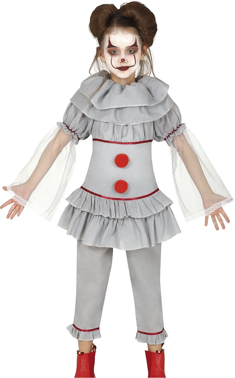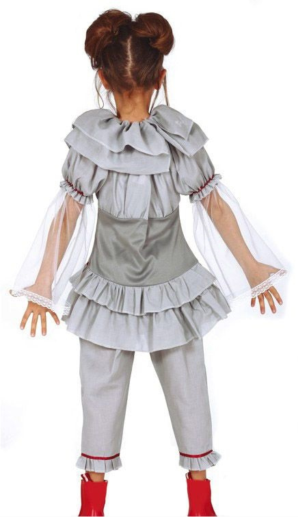 Przebranie utrzymane jest w szarych odcieniach z czerwonymi akcentami. Bluzka z nierozciągliwego materiału posiada krój tuniki z falbaną na dole oraz z bufiastymi długimi, ażurowymi rękawami. Rękawy posiadają mankiety zakończone koronką. Na przodzie przyklejone dwa charakterystyczne, czerwone pompony, które dodają kontrastu i podkreślają klasyczny wygląd klauna. Spodnie z nogawkami do pół łydki, również zakończone są falbaną. Posiadają gumkę w pasie dla lepszego dopasowania do figury. Przebranie dopełnia szary, marszczony kołnierz zapinany na karku na rzep.