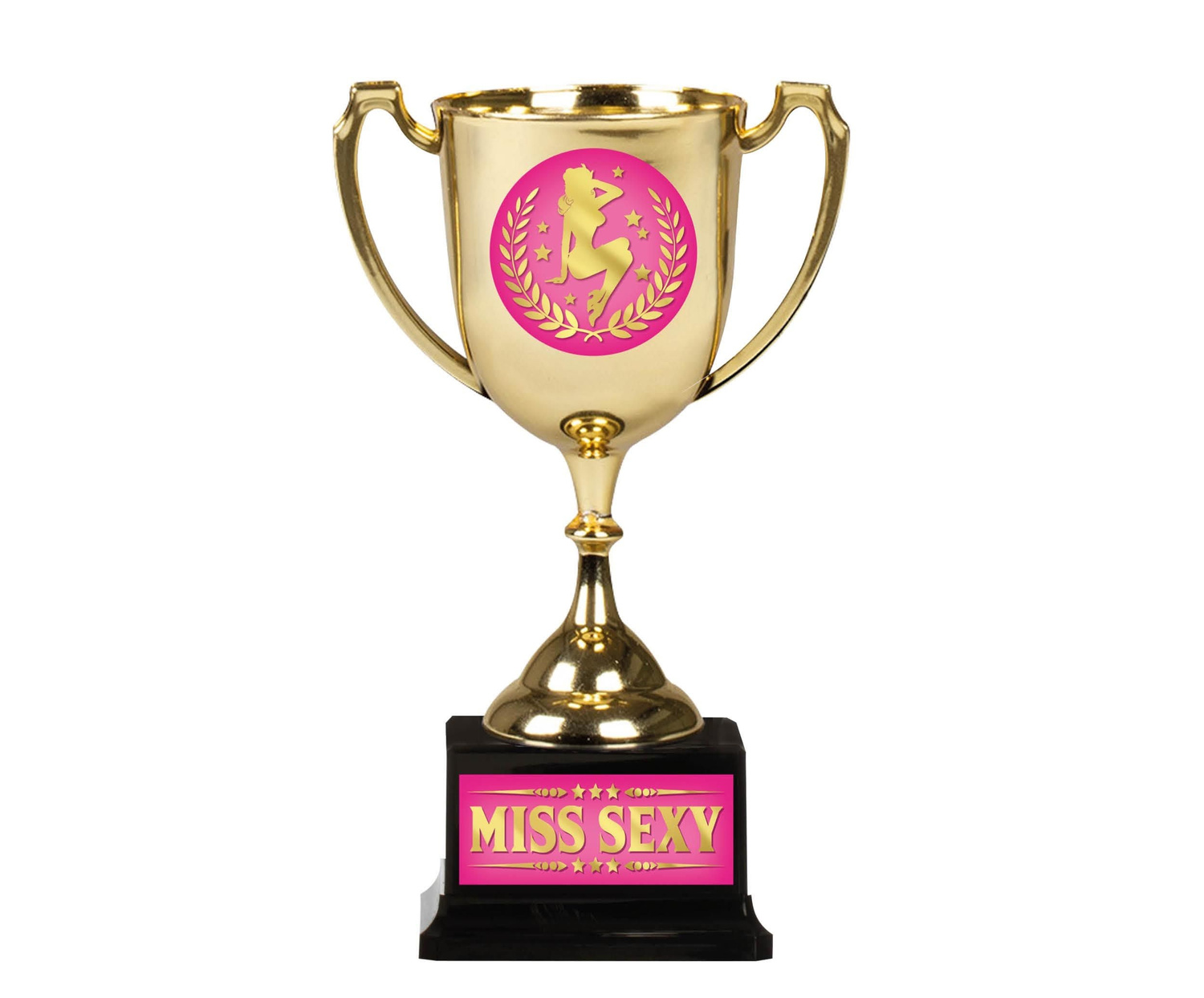 Złoty puchar z różowo-złotym napisem „MISS SEXY” to humorystyczne trofeum, które idealnie sprawdzi się jako prezent lub nagroda podczas wieczorów panieńskich, urodzin, imprez tematycznych lub konkursów piękności z przymrużeniem oka! Nagroda wykonana jest z tworzywa, kielich jest w złotym kolorze z naklejką dziewczyny w złotym kolorze na różowym tle oraz laurem zwycięzcy, natomiast podstawka w czarnym. Trofeum posiada uchwyty po obu stronach kielicha.