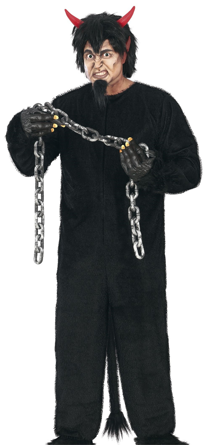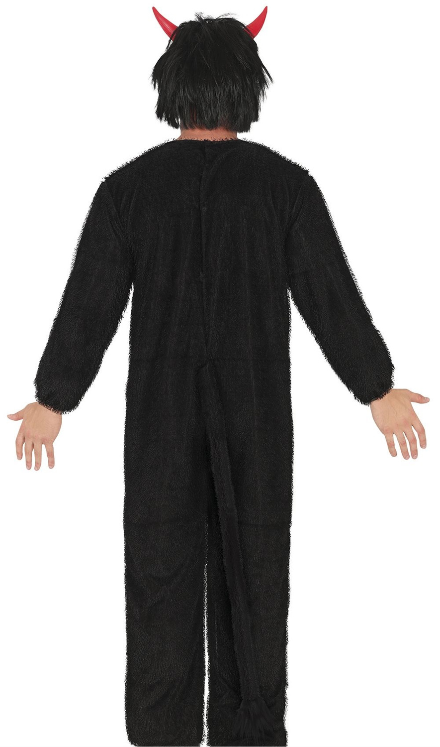 Jednoczęściowy kombinezon diabła - Krampusa, z powodzeniem może być użyty dla stylizacji czarnego kota. Kigurumi wykonane z miłego w dotyku materiału w czarnym kolorze o futrzanej strukturze. Posiada podszewkę. Zapinany z tyłu na rzepy. Mankiety i nogawki wykończone gumką. Z tyłu przyszyty na stałe długi, usztywniony czarny ogon.