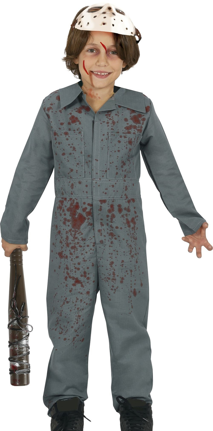- Kostium rodem z horroru składa się jednoczęściowego kombinezonu, który wykonany jest z materiału w kolorze niebieskoszarym. Całość ubrudzona farbą, która imituje krew. W zestawie z maską psychopatycznego mordercy. Nie zawiera maczety.