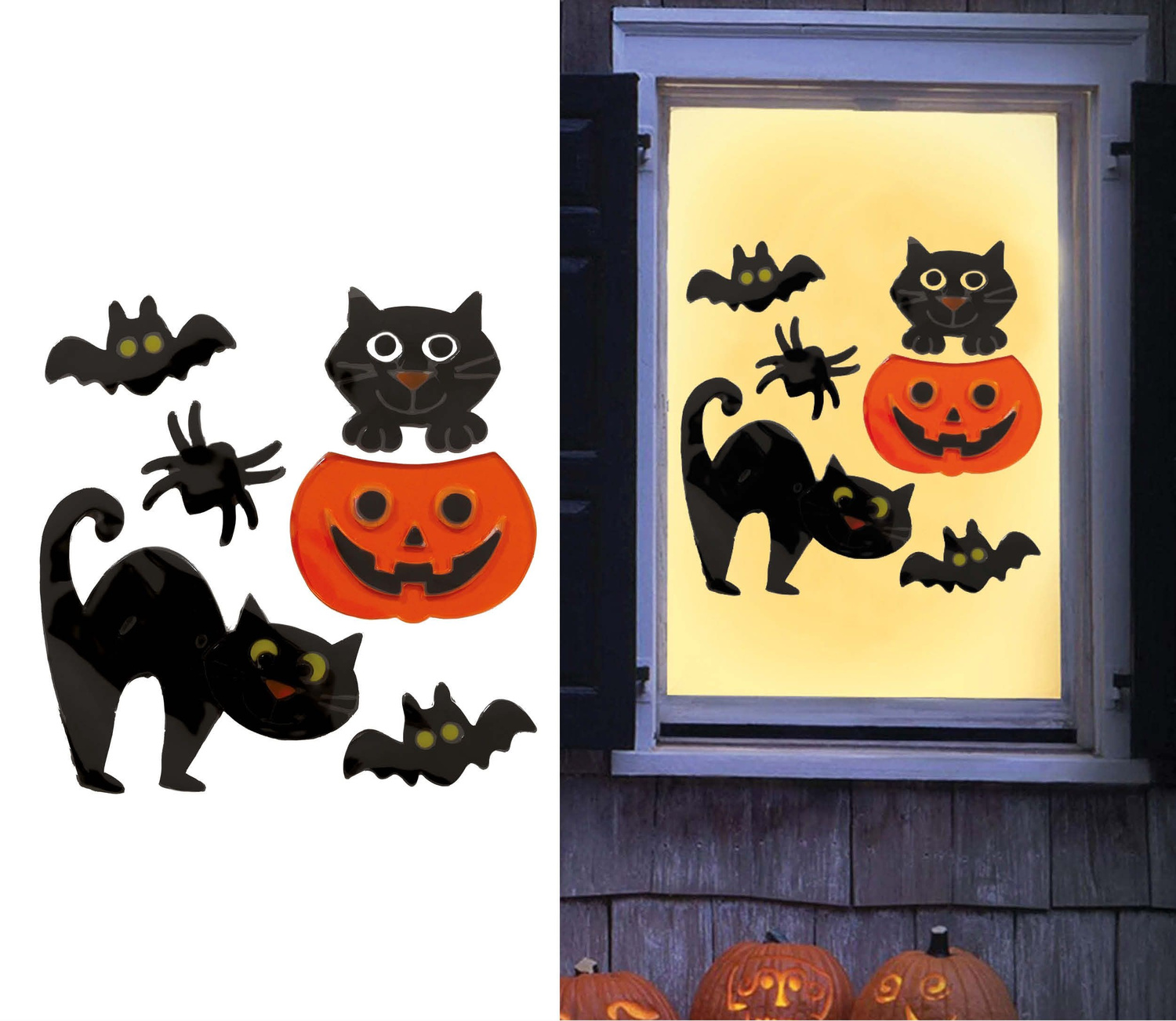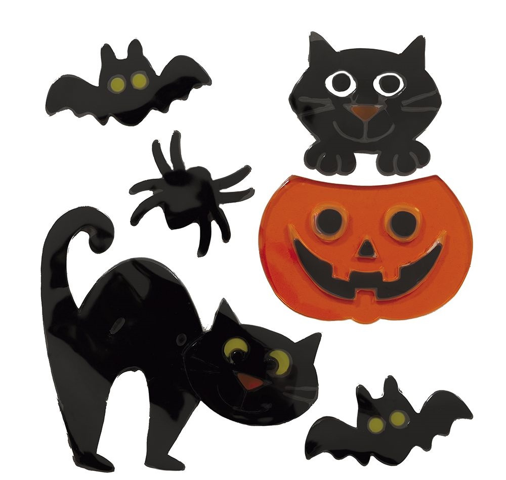 • Żelowa dekoracja w czarnym i pomarańczowym kolorze prezentująca koty, nietoperze, pająk. Idealne przyozdobienie szyb czy luster na każdym halloweenowym przyjęciu, zwłaszcza dla dzieci.