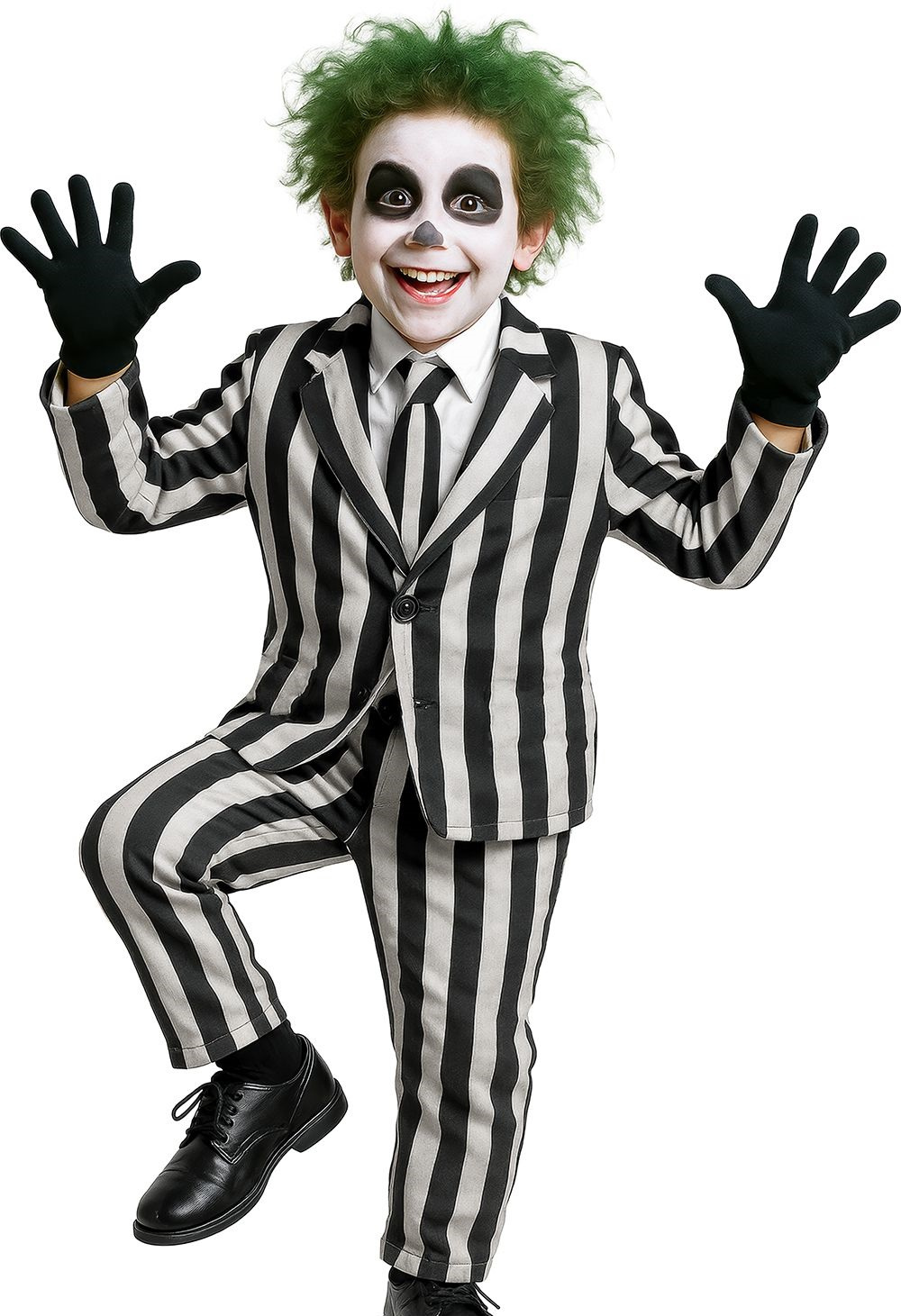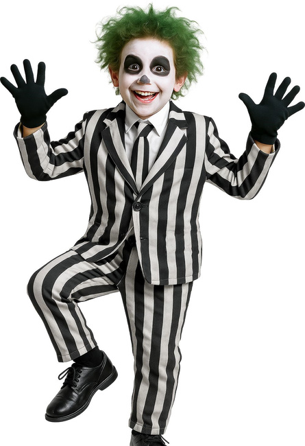 Kostium inspirowany postacią Beetlejuice - dziwacznego, demonicznego "bioegzorcysty", który ma pomóc duchom w przepędzeniu żywych ludzi z nawiedzonego domu. Idealny na Halloween, imprezy przebierane, cosplay czy karnawał. Strój łączy komiksowy styl z odrobiną groteskowego humoru, świetnie oddając klimat bohatera. Znakomicie sprawdzi się także w stylizacji więziennego eleganta, mima czy klauna.