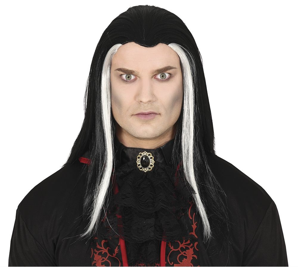 Włosy syntetyczne, czarne zaczesane lekko do tyłu, po bokach powyżej skroni białe pasemka. Fryzura połyskująca. Peruka na obwodzie posiada gumkę przez co lekko się rozciąga oraz podszewkę w postaci czarnej siateczki, dzięki której głowa lepiej oddycha. Peruka będzie idealnym dodatkiem na bal przebierańców do kostiumu Hrabiego Draculi Monte Christo, wampira, wiedźmina, maga, a także jako fantazyjny gadżet na przyjęcia okolicznościowe.