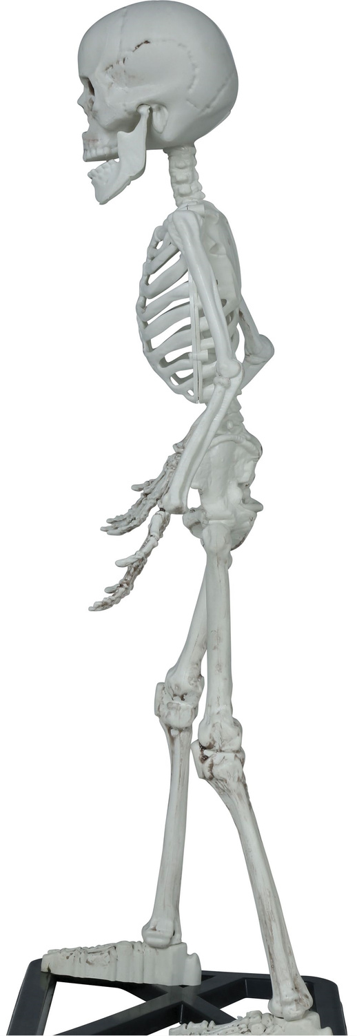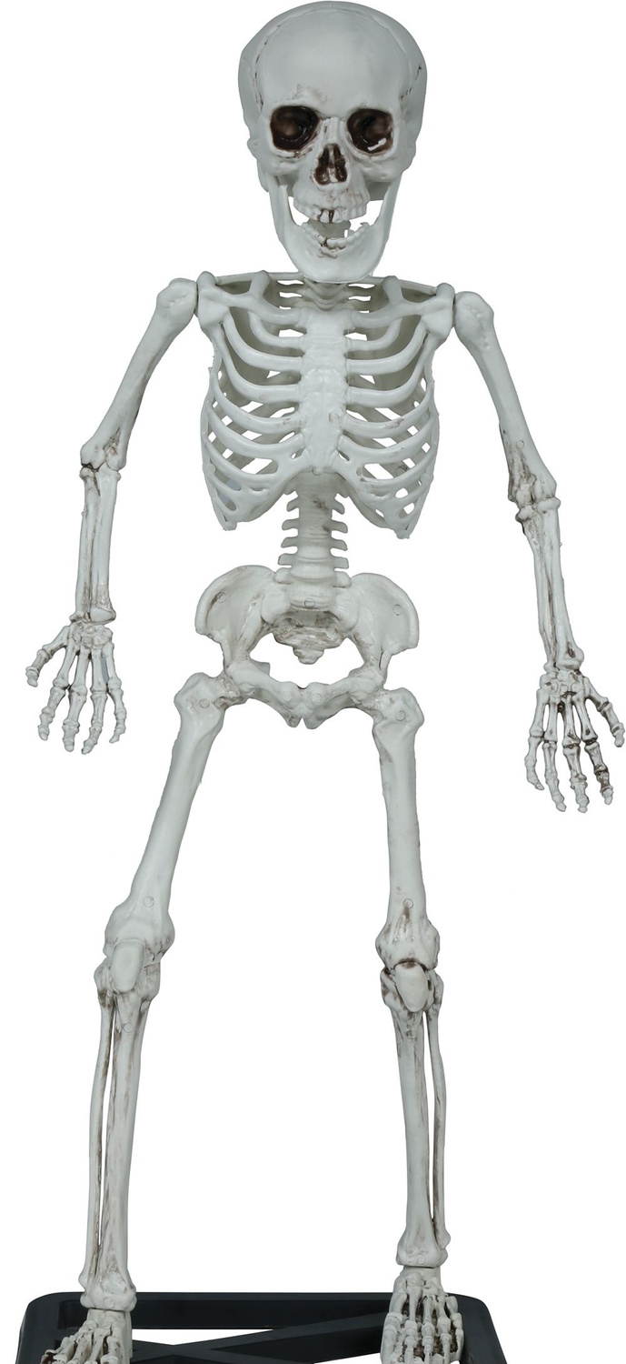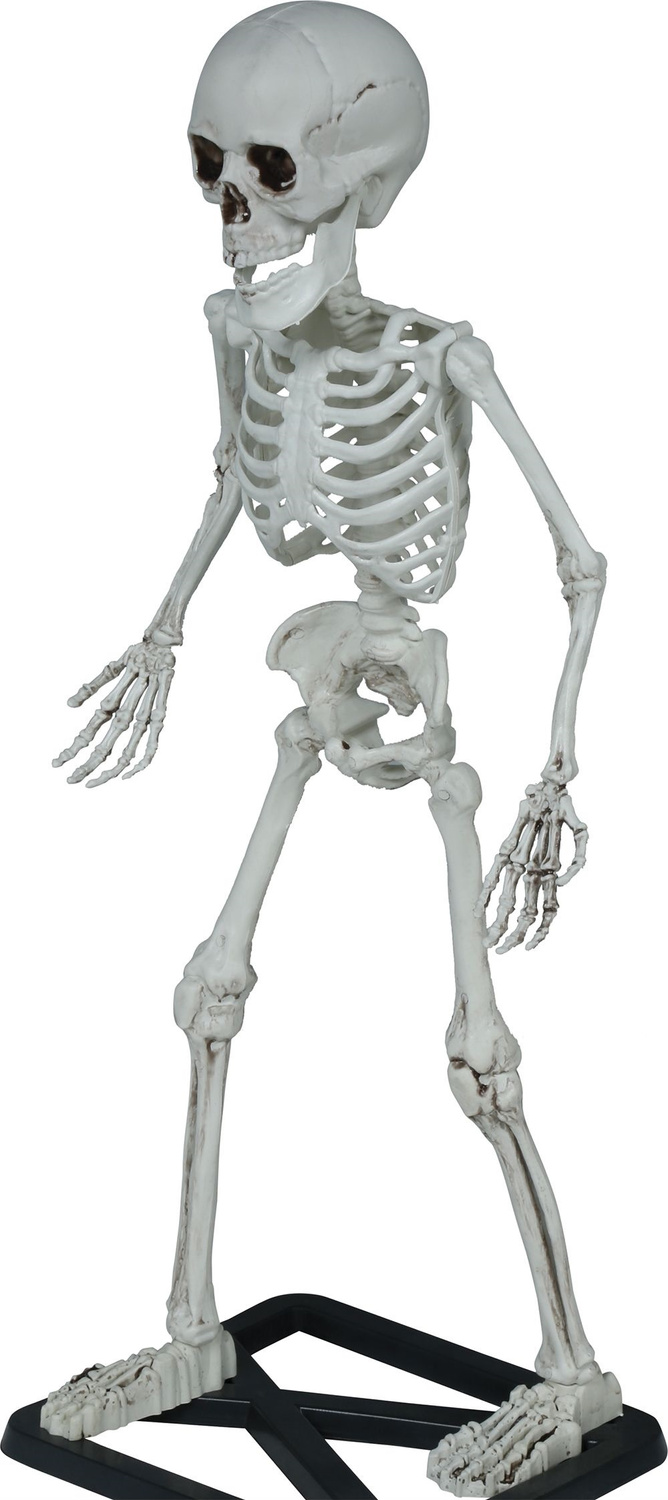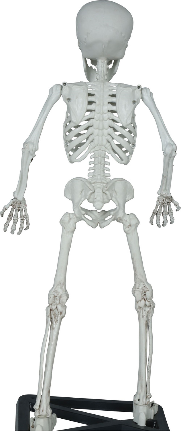 - Trójwymiarowy szkielet człowieka do dekoracji na Halloween. Szkielet wykonany z tworzywa, posiada ruchome ręce oraz żuchwę. Ustawiony jest na czarnej podstawce, dzięki czemu stoi samodzielnie.