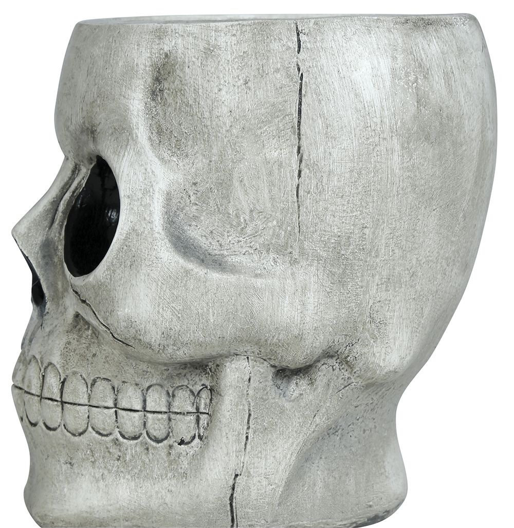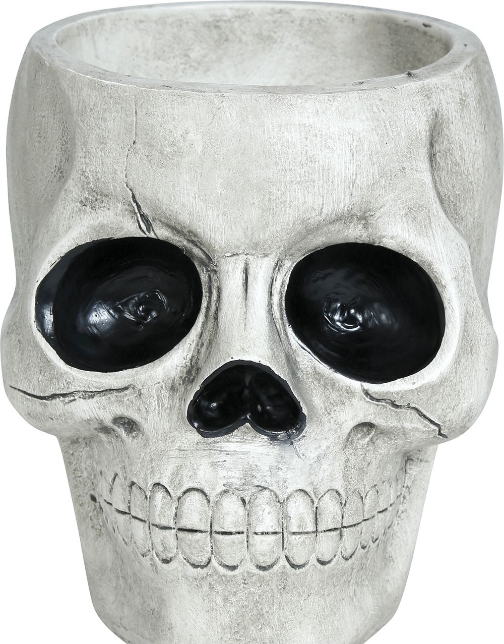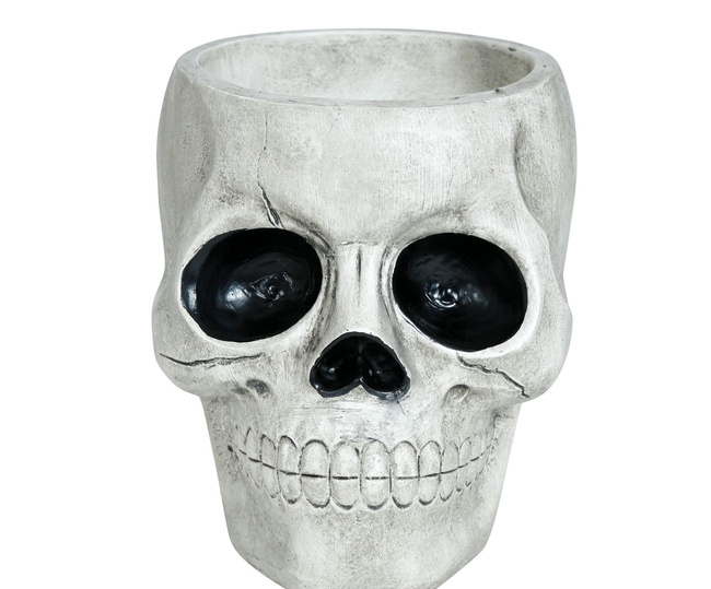 • Dekoracyjna miseczka w kształcie ludzkiej czaszki. Wykonane z gipsowego tworzywa. Czacha posiada zabarwione na czarno oczodoły, nos oraz częściowo zęby, Czaszka może być wykorzystana jako dekoracja stoły, parapetu lub wejścia do domu z okazji Halloween.