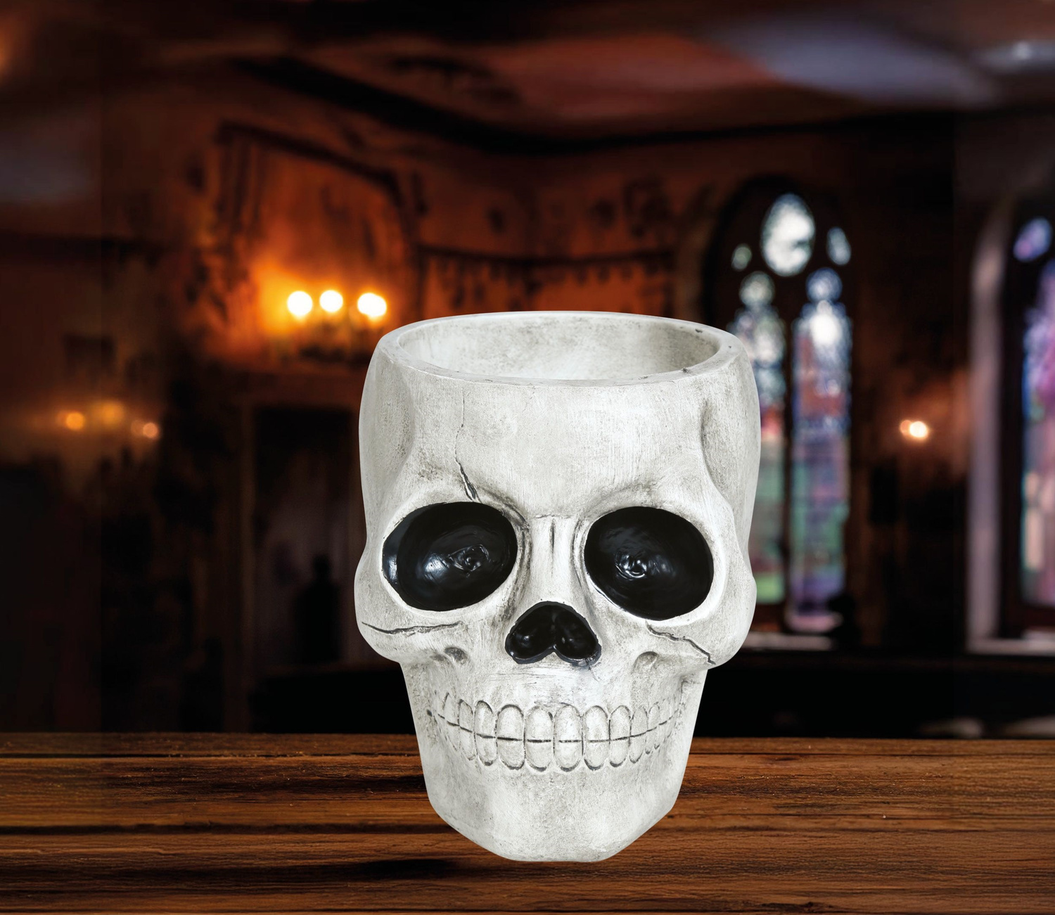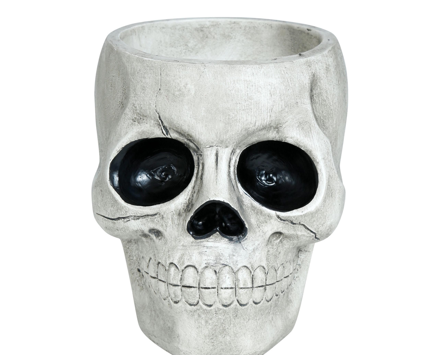 Dekoracyjna miseczka w kształcie zagłębienia w czaszce to idealny dodatek dla miłośników mrocznego klimatu! Utrzymana w realistycznym stylu, z widocznymi pęknięciami i głębokimi oczodołami, doskonale sprawdzi się jako oryginalna ozdoba na Halloween, imprezy tematyczne w gotyckim stylu czy Dia de los muertos, a także jako wyjątkowy element wnętrza. Można w niej serwować przekąski typu orzeszki, używać jako pojemnik na przybory, osłonkę do roślinki lub efektowną dekorację stołu. Wykonana z tworzywa gipsowego, jest dość ciężka co nadaje jej stabilności.