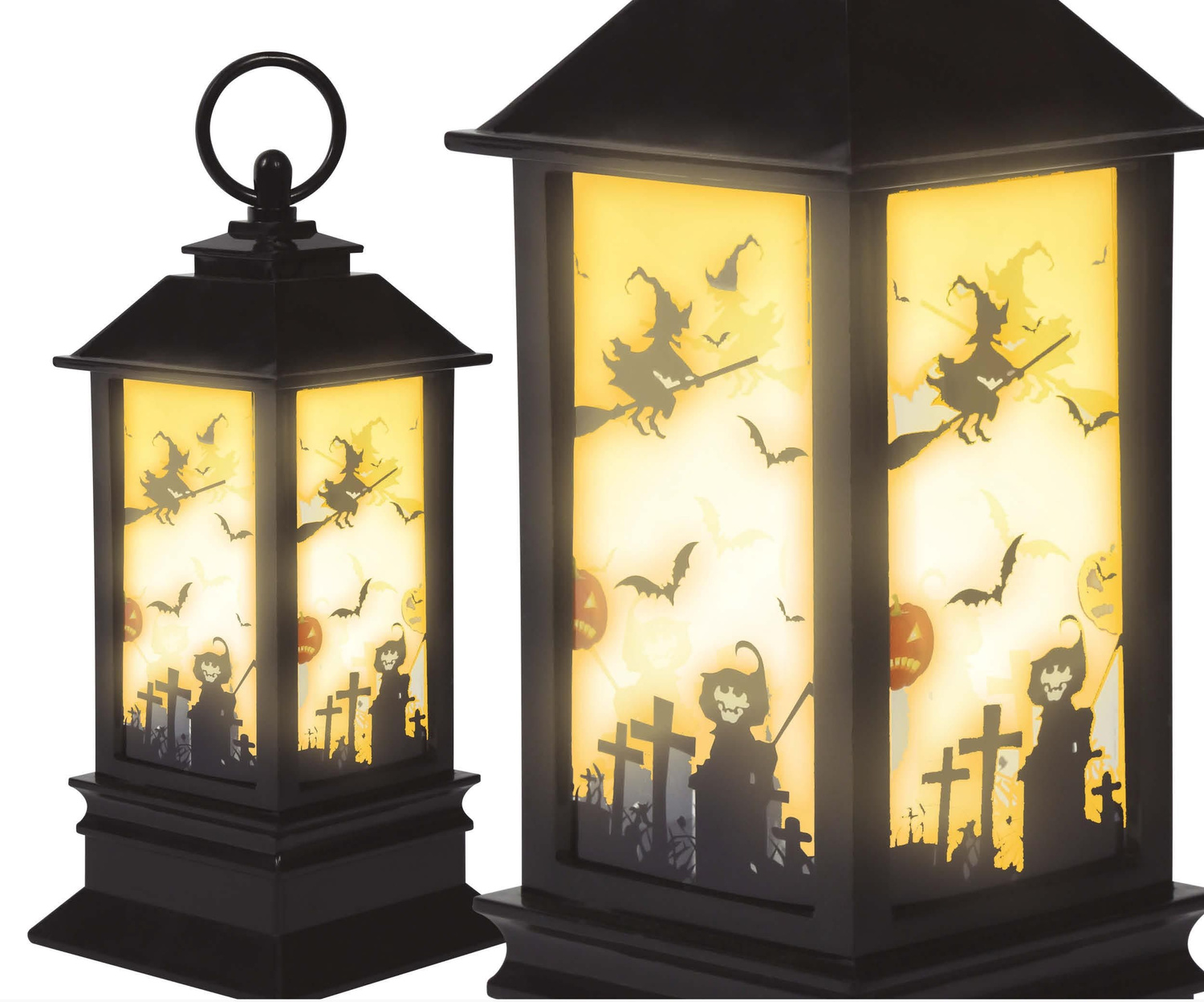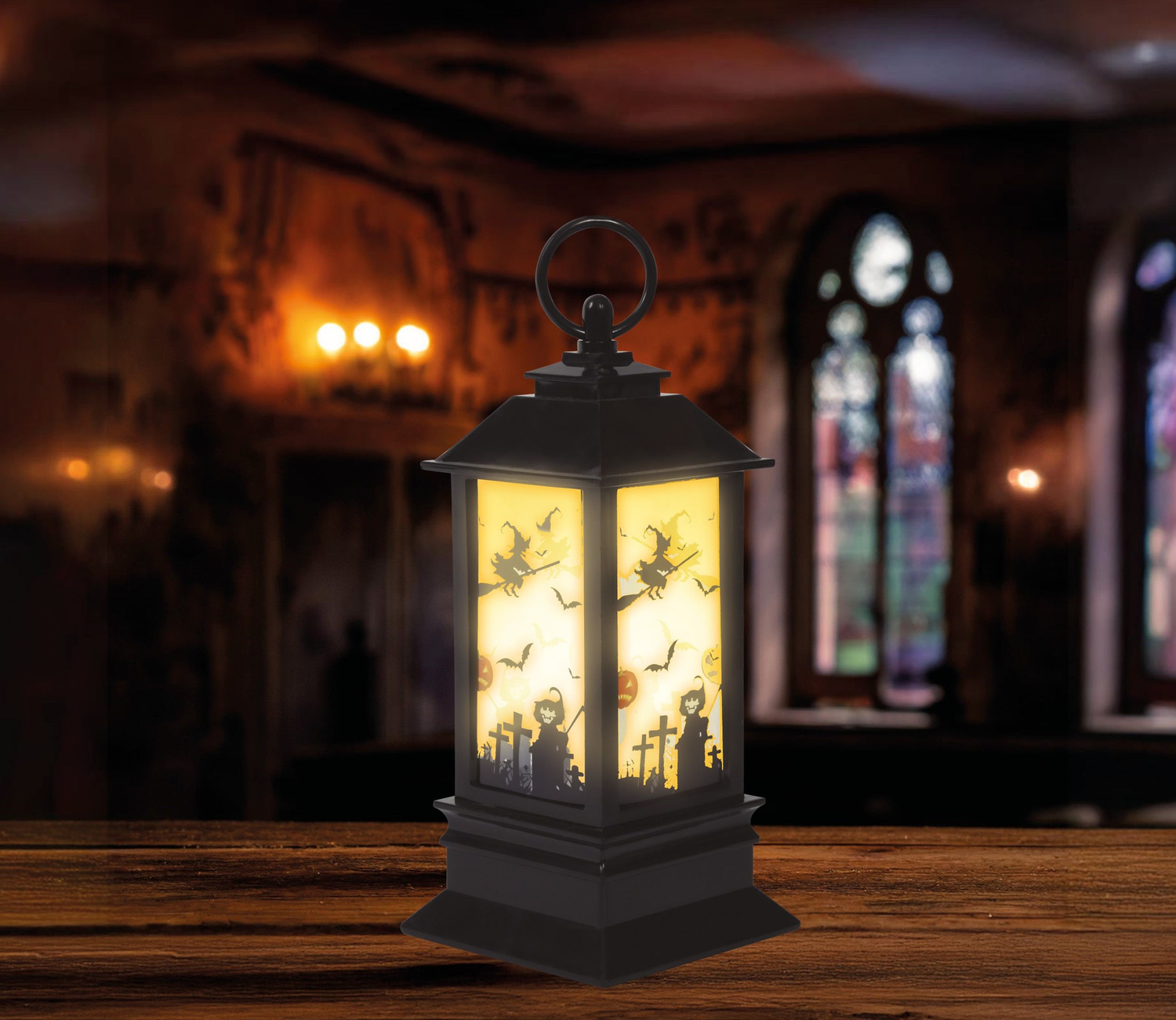 Dekoracyjna latarnia LED w klimacie Halloween. Wykonana z tworzywa w czarnym kolorze, ze ściankami ozdobionymi motywami czarownic na miotle, nietoperzy, nagrobków oraz upiornych dyni. W środku plastikowa świeczka, która emituje ciepłe, migające światło, które tworzy wyjątkową atmosferę grozy.
