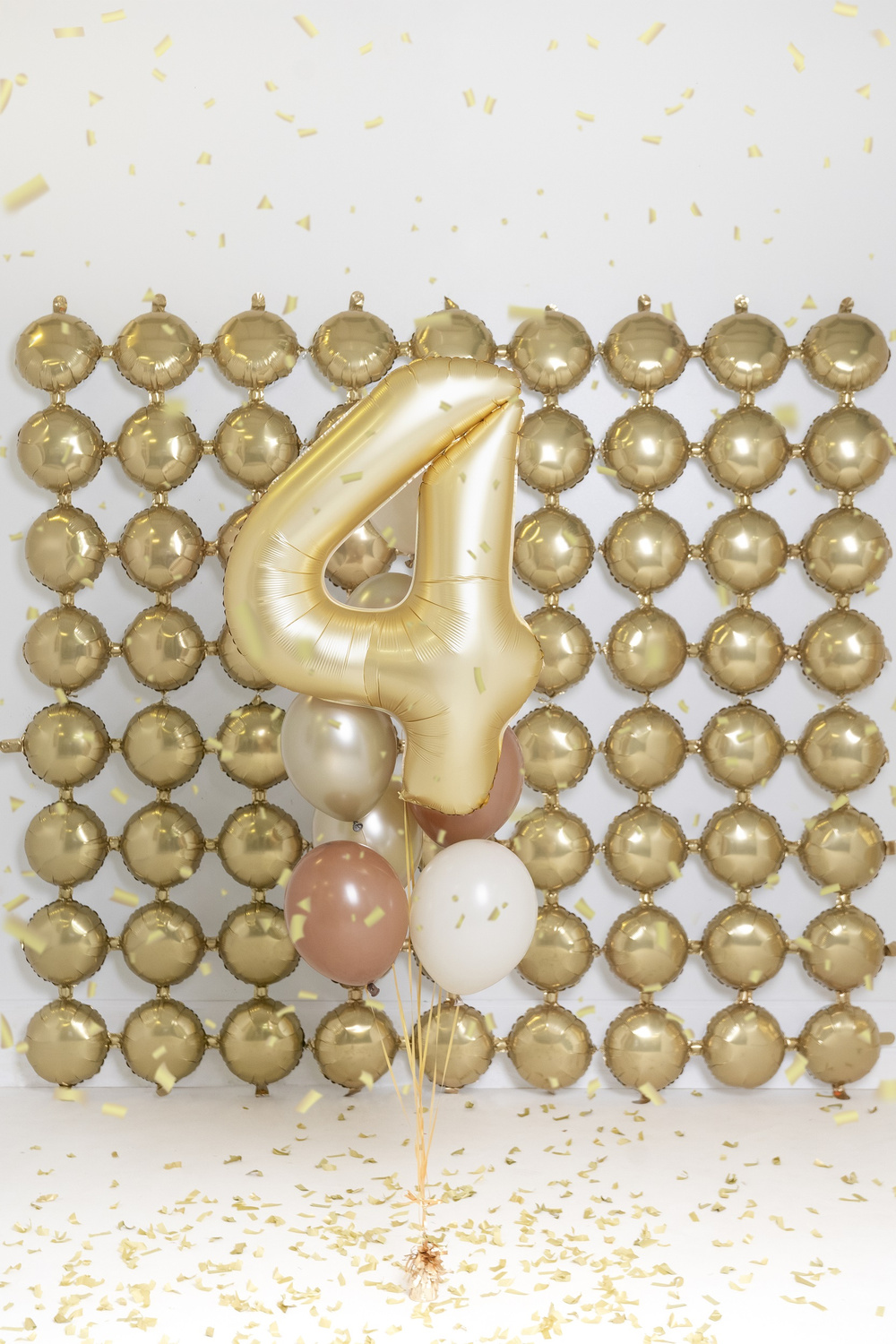 Balon foliowy w kształcie cyfry 4. Balon jest w kolorze złotym z satynową powłoką, która daje efekt eleganckiego matu. Złożony z innymi cyframi tworzy dowolny numer. Znakomity aby podkreślić uroczystość czwartych urodzin bądź rocznicy.