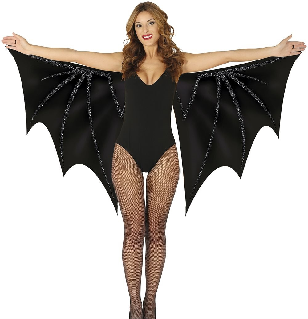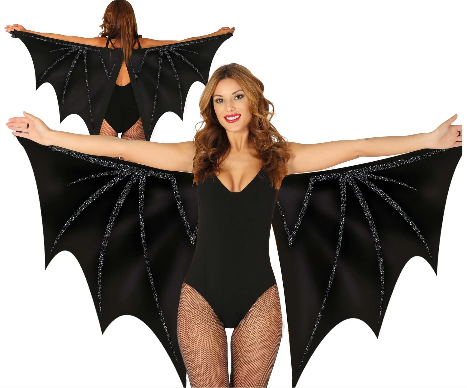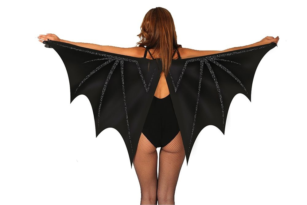 Efektowne skrzydła nietoperza dla dorosłych. Peleryna jest w kolorze czarnym, ozdobiona srebrzystymi brokatowymi liniami, nadają stroju wyjątkowego, mrocznego charakteru. Mocowana na ramionach (zakładana na plecy jak plecak) posiada uchwyty z gumek na palec, rozkłada się szeroko, tworząc imponujący efekt rozpostartych skrzydeł.