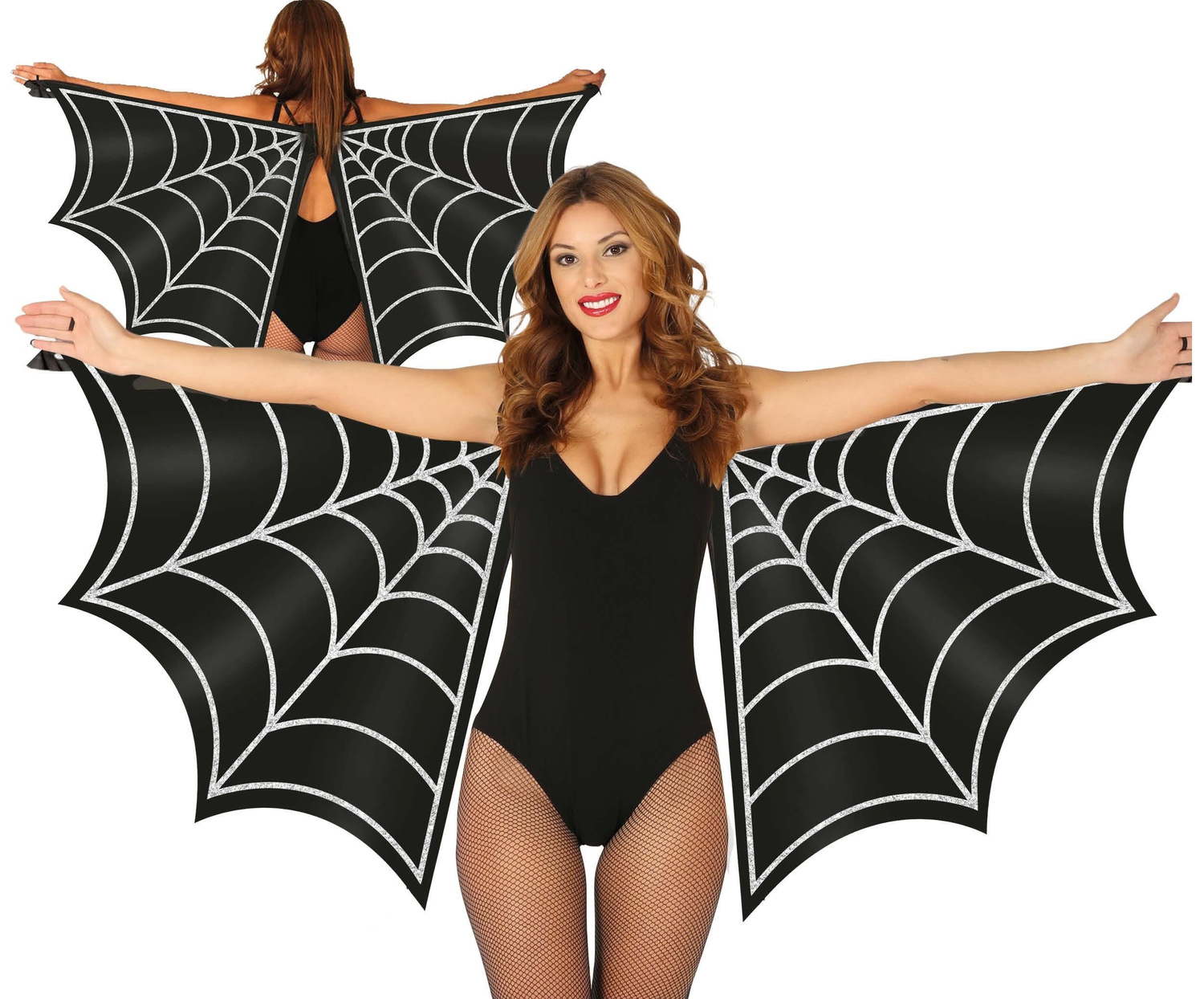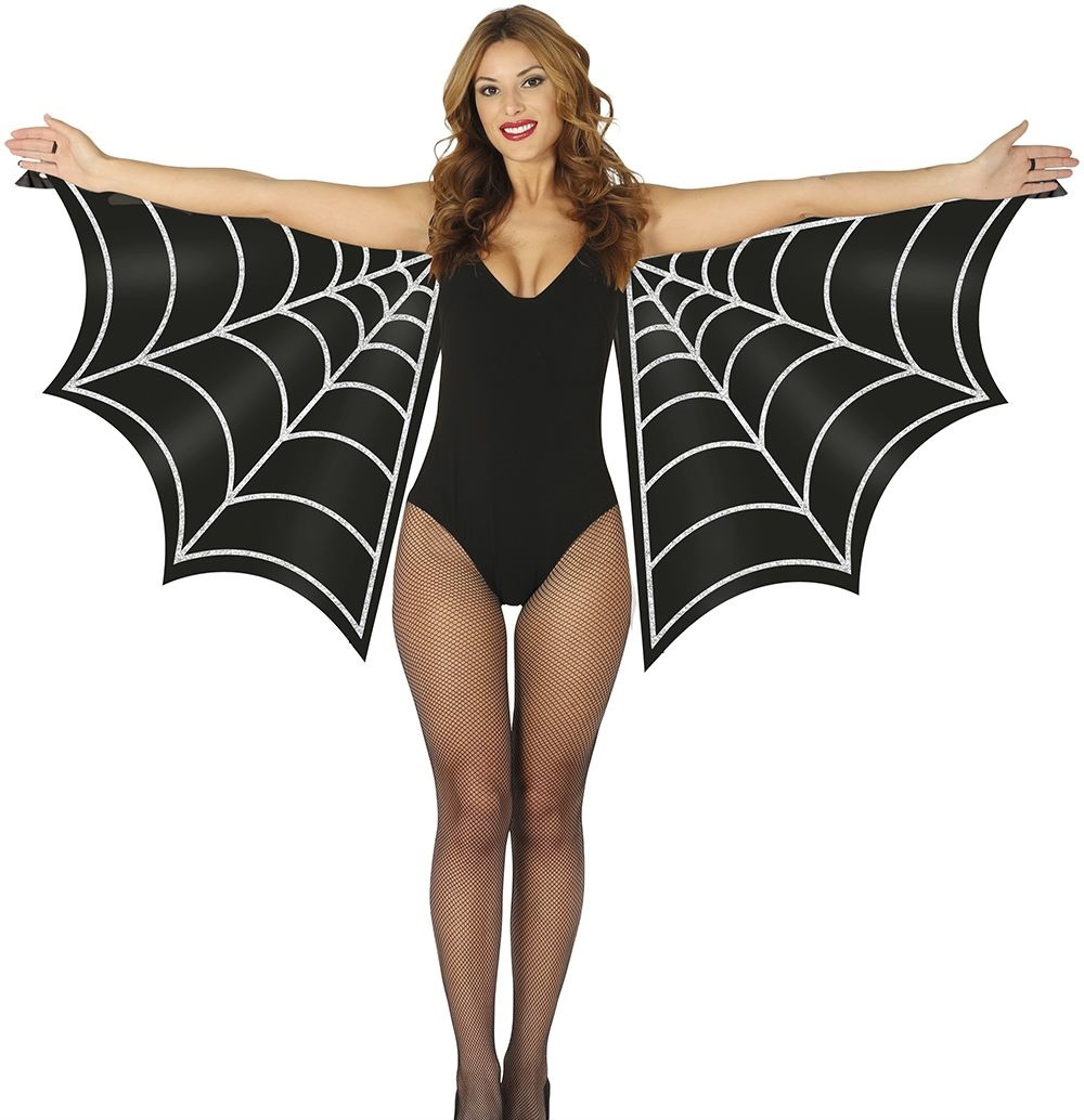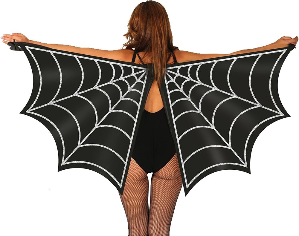 Efektowne skrzydła dla dorosłych. Peleryna jest w kolorze czarnym, ozdobiona srebrzystymi brokatowymi liniami, które nawiązują do sieci pajęczej. Pajęczyna nadaje stroju wyjątkowego, mrocznego charakteru. Mocowana na ramionach (zakładana na plecy jak plecak) posiada uchwyty z gumek na palec, rozkłada się szeroko, tworząc imponujący efekt rozpostartych skrzydeł.
